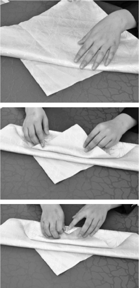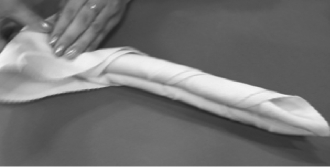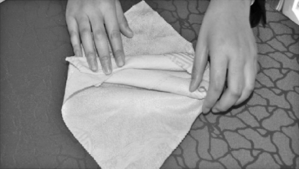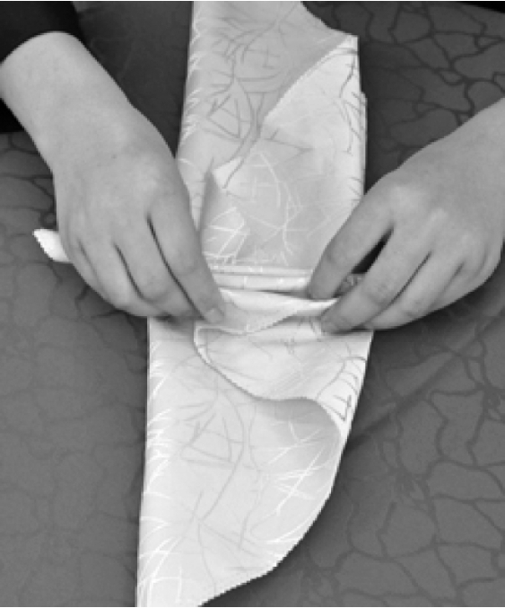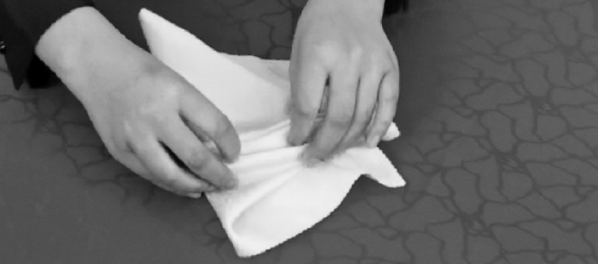 ③握住距对折点约为7cm处,作为折点,将两侧的餐巾分别沿折点对折。