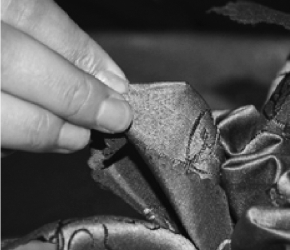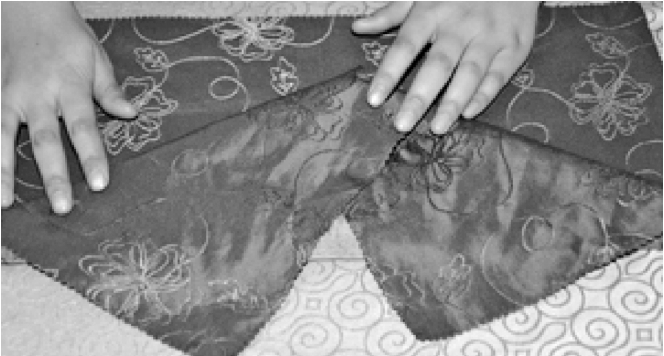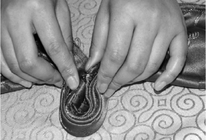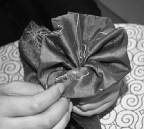 ⑤将上端两侧巾角下拉做花瓣,外翻夹层做花芯,将下端两个巾角上拉分别做大雁的头部和尾部。