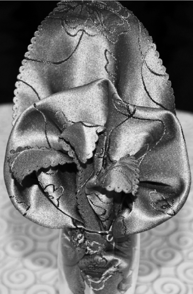 ⑥握住餐巾,放入杯中,整理花芯、花瓣成型。