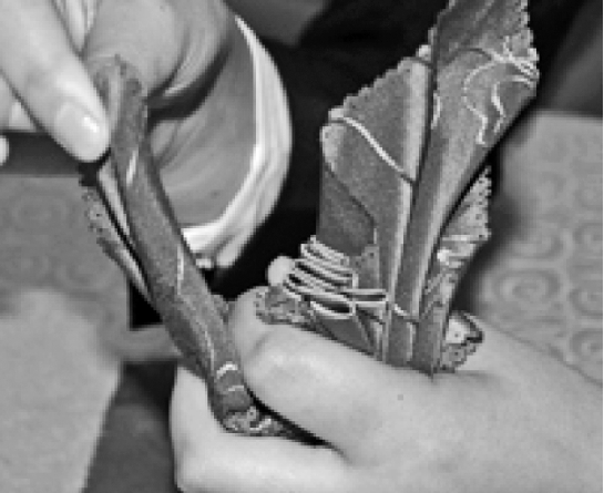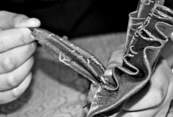 ②将底边向顶角方向卷筒,并留下高约为25cm的小三角形。