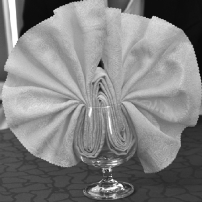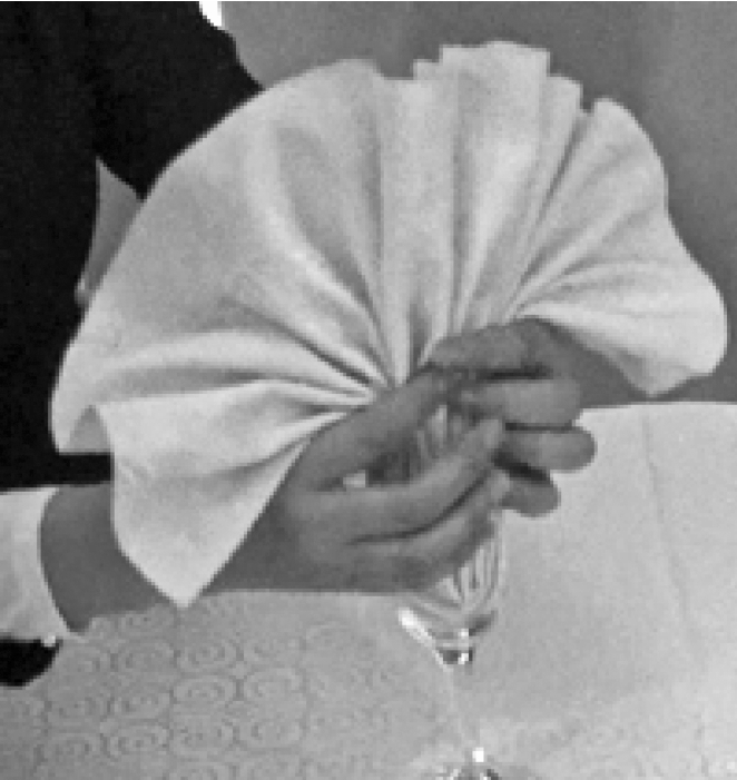 ④捏住餐巾中间位置,将餐巾四个角向上翻,并固定到餐巾中间位置。