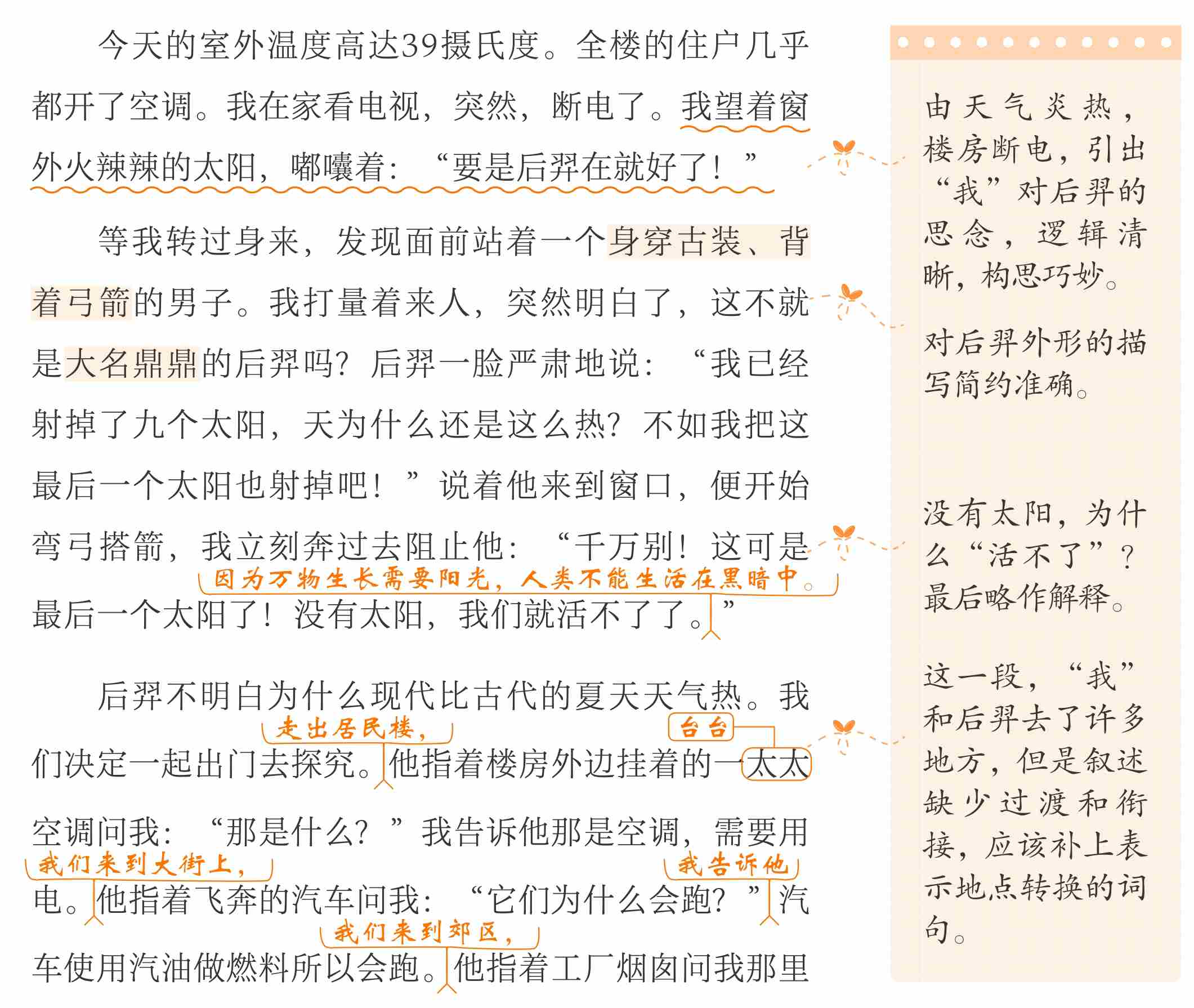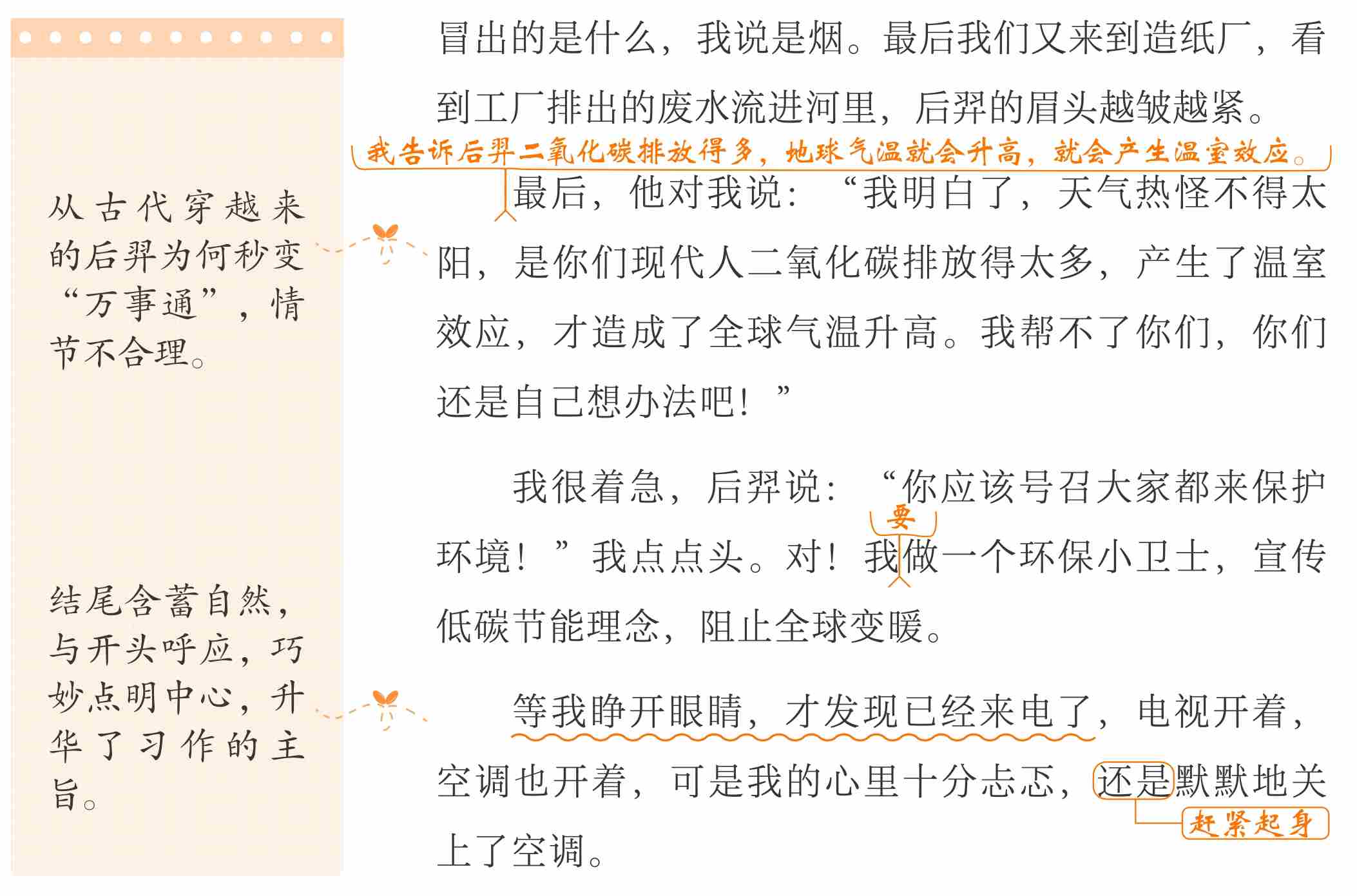 这篇习作的立意比较深刻,小作者深入观察生活,结合最近几年全球气温不断升高的现象深入思考,从现实找原因,并借助想象,与神话人物后羿进行了一番神奇的科学探究,终于找到了原因——人口激增、碳排放日益增加,造成了全球气温的升高。故事情节波澜起伏,很有看点。但是有些遗憾的是某些细节的处理不到位,比如外出参观时,地点的转换比较突兀,缺少过渡,又比如结论由后羿之口说出,很怪异,不合逻辑。如果能将这两处细节处理好,本文不失为一篇构思巧妙、发人深省的佳作。