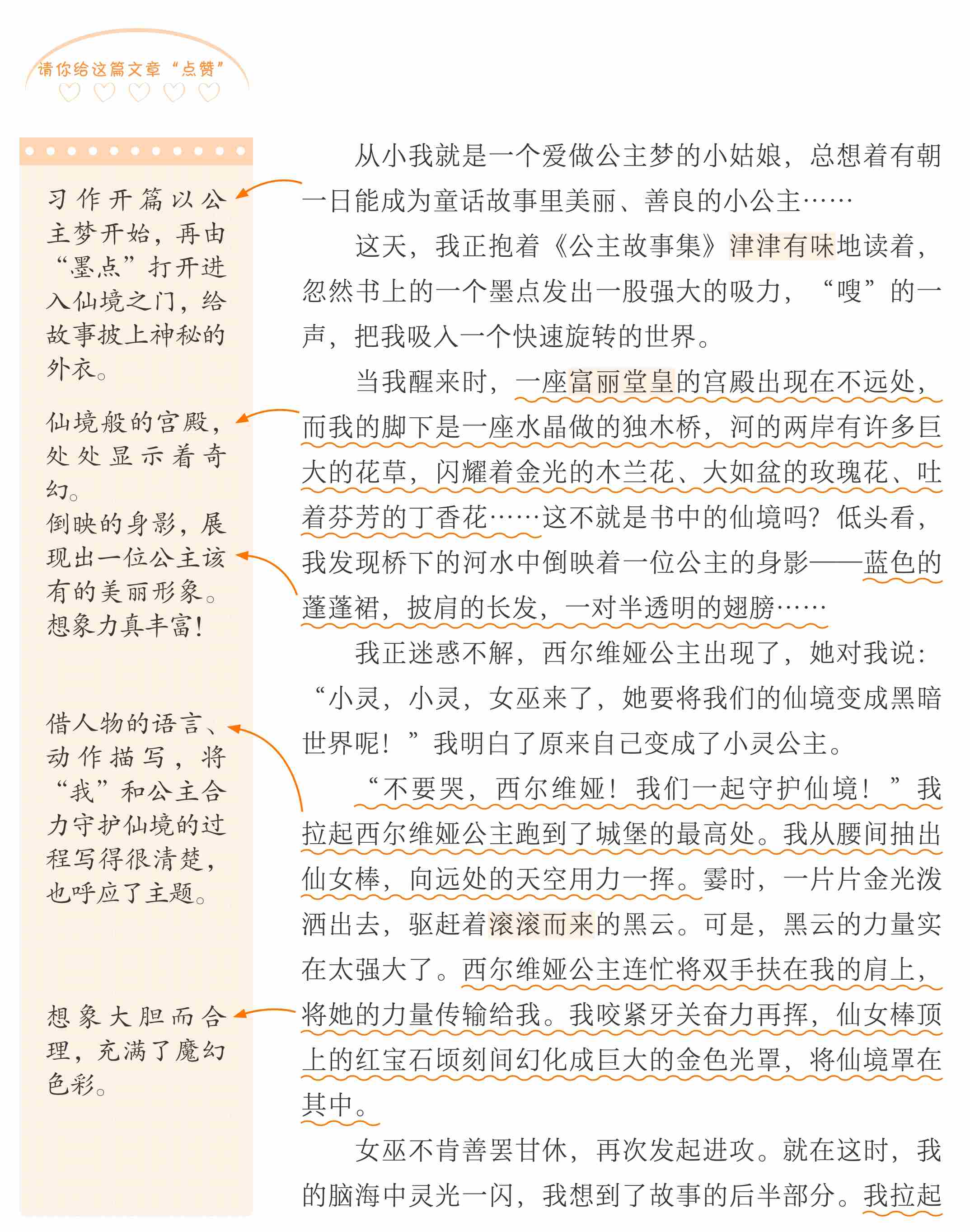 本文构思巧妙,意蕴深远,特别是借“牺牲自我”很好地诠释了“守护”的含义,揭示主旨。此外习作情感细腻,描写贴切。通过语言、动作的巧妙刻画,再现了善良美丽、勇于牺牲的公主形象,如见其人、如闻其声。习作结构十分严谨,首尾呼应,富有创意。以“墨点”开始设置悬念,引人入胜;又以“黑墨点”结束,言简意赅,收束有力。
