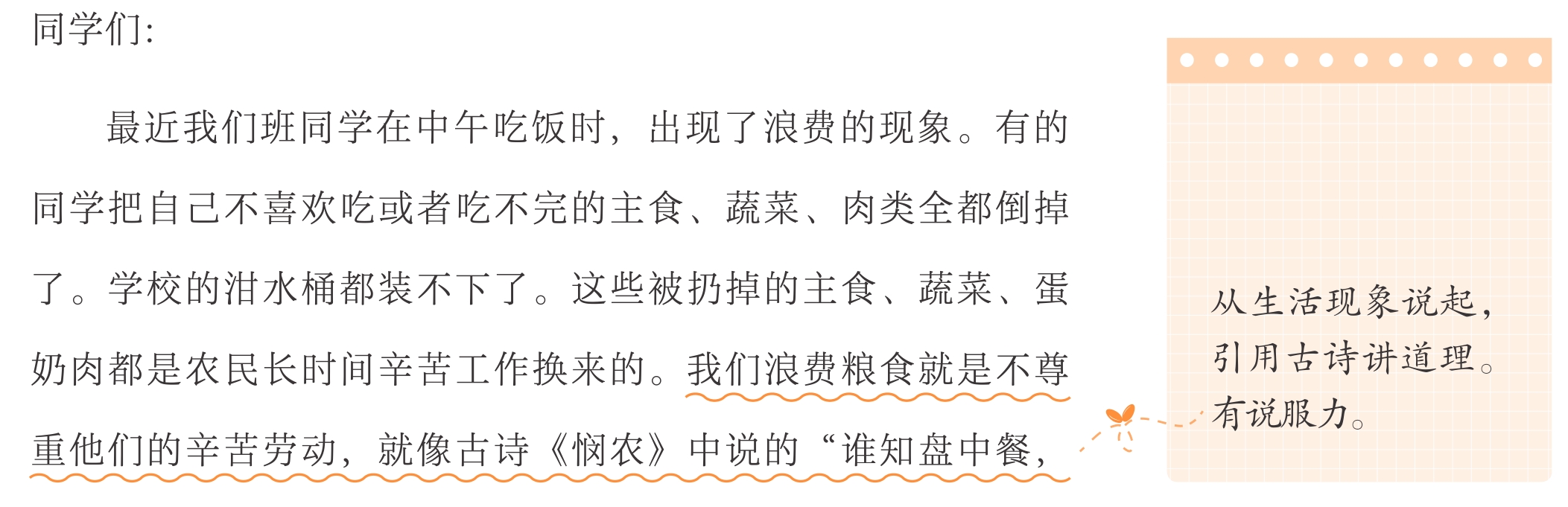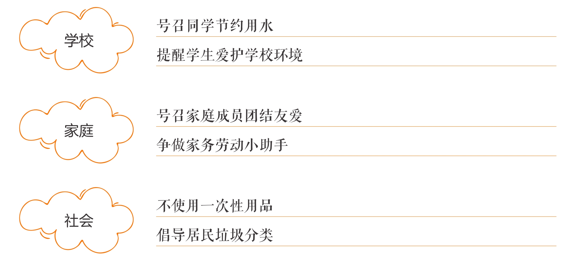 。千万不能前一个观点包含后一个观点。比如倡议节约粮食可以从家庭、学校、饭店三个不同的场景来写,说说如何节约。再如倡议节约用纸,可以从“正反面用纸”“发无纸通知”“不用纸杯”等举措写起。
