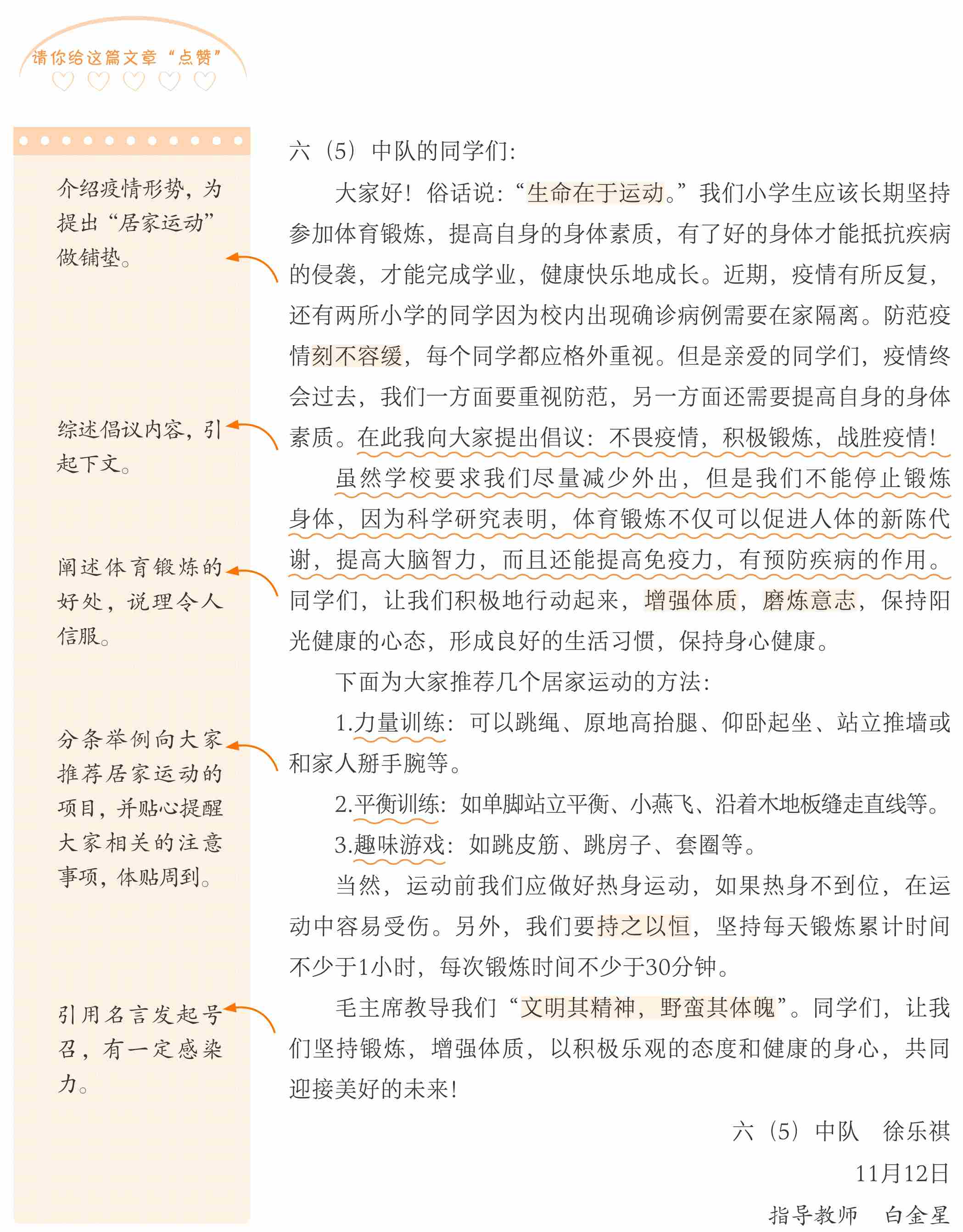 小作者展开自己的思路,具体写出了居家锻炼的好处和措施,充分的理由足以让读者信服。从时代大事着眼,从身边小事入手,小作者抓住疫情下同学们居家生活学习缺乏运动的实际情况,细致入微地写出了居家锻炼的好处和具体措施。习作格式规范,表达准确、生动,突出了倡议书的特点,能切实发挥倡议的作用和效果。