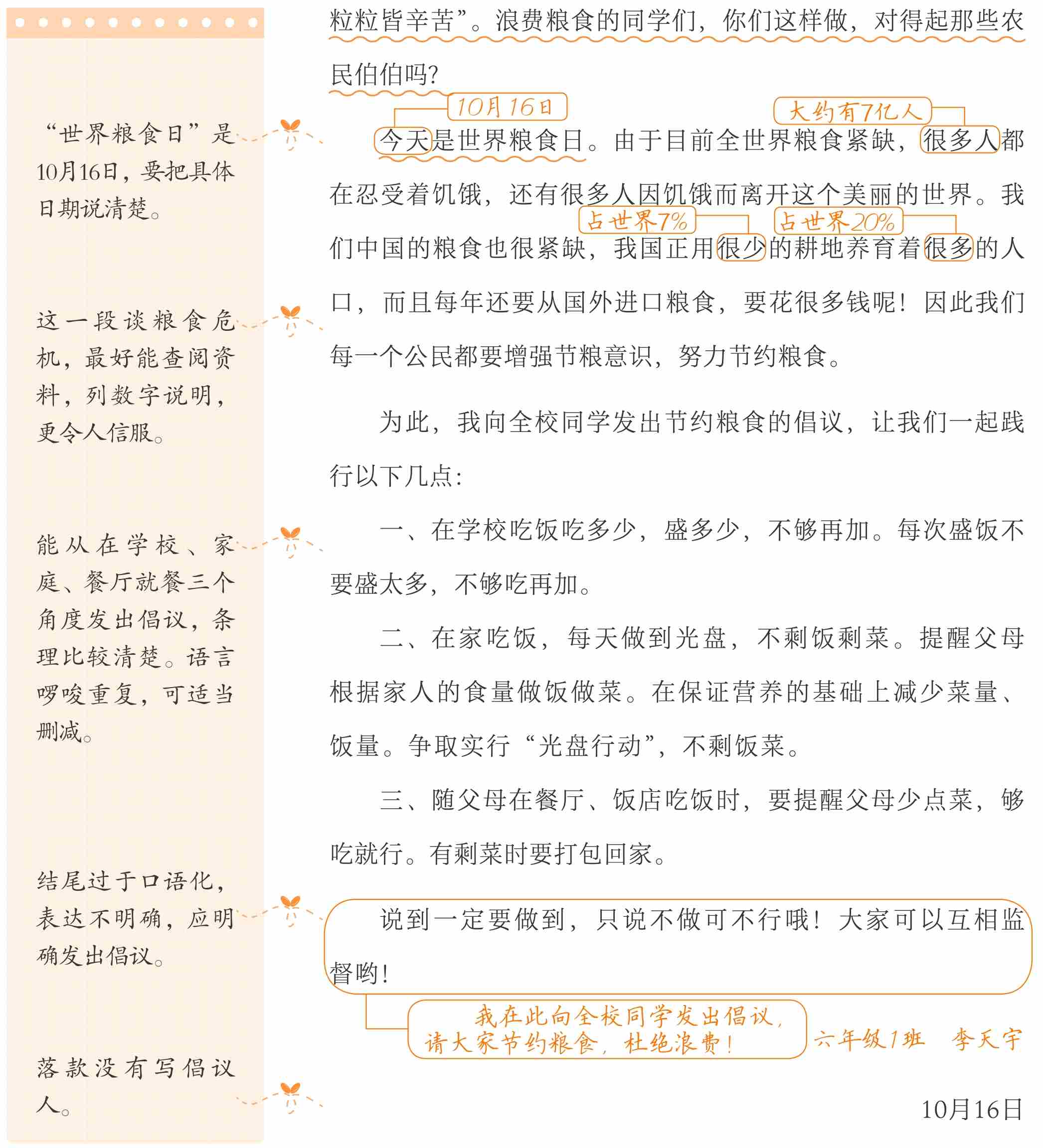 本文选材比较新颖,立意深刻。小作者能认真观察生活,发现同学中有浪费粮食的人,于是在10月16日“世界粮食日”向全班同学发出倡议,号召大家节约粮食。但是在介绍倡议背景时,表达不清晰,最好用准确的数字来说明“粮食危机”的紧迫,这样会更有说服力、感召力。倡议书的语言不要过于口语化。结尾可以再一次发出号召,明确提出倡议。