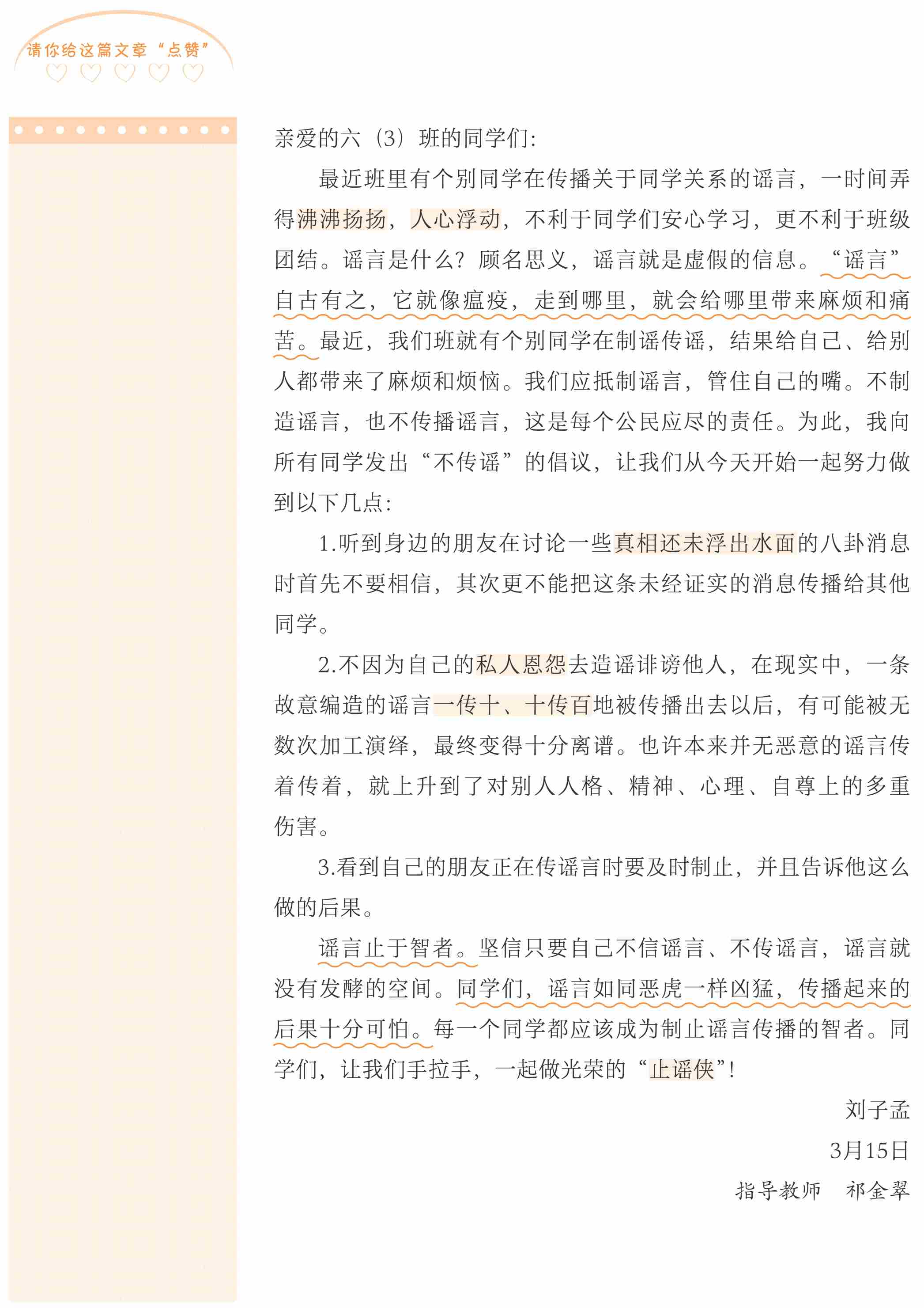 习作选材新颖,能从班级生活的实际情况出发,发出倡议,号召同学不信谣、不传谣,争做“止谣侠”。习作条理清晰,能晓之以理,动之以情,有一定说服力。提出的建议操作性很强,语言朴实而不失幽默。