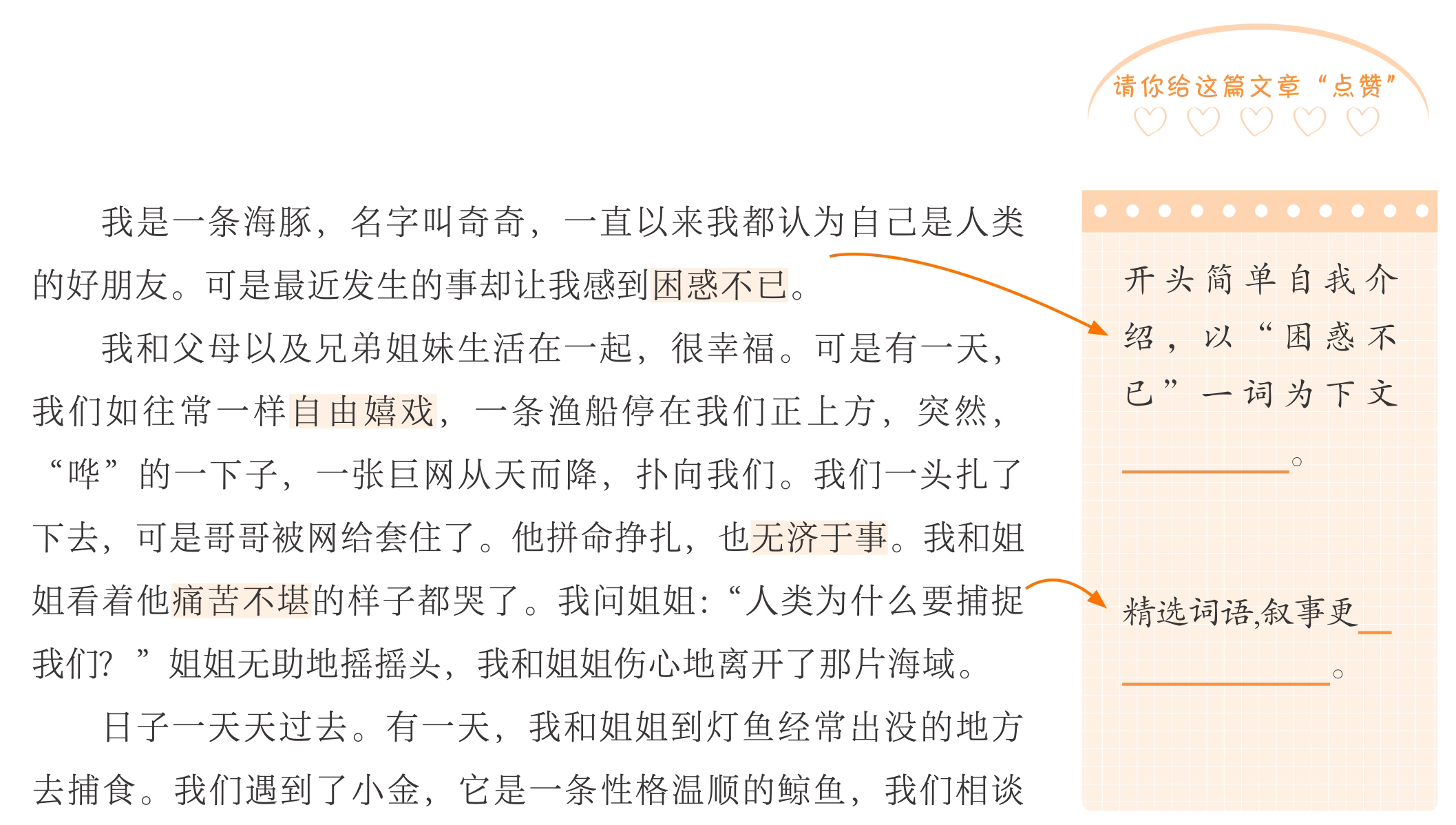 从一条小海豚的视角出发,揭露了海洋生物遭受伤害的现象,引起读者思考:人类该怎样与动物和谐相处?故事情节跌宕起伏,能联系现实,对破坏海洋生态、伤害海洋动物的现象作出批判,习作的立意深刻。把事情的经过部分写得很详细,把小海豚的不幸遭遇介绍得清清楚楚。在语言表达上注意了句子的衔接、段落的转承。故事具有一定趣味性。