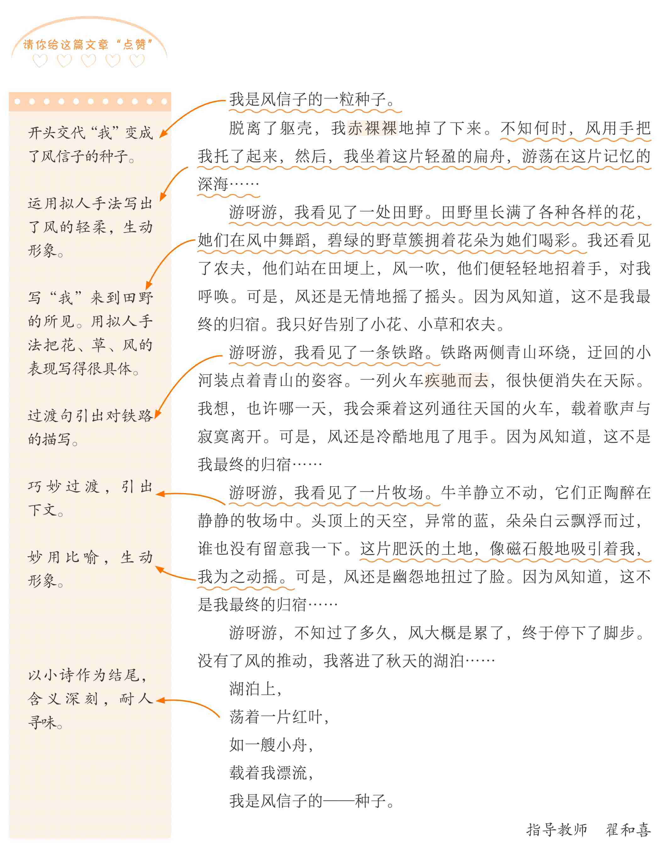 小作者先写自己变成了一粒种子,然后写自己看见了一处田野、一条铁路和一片牧场,并流露出自己对生活的喜爱。“我”的游历过程和在三处的见闻就是想象的重点内容,小作者不仅写了“我”看到了什么,还写了“我”做了什么,想到了什么,这样写就把重点内容写详细了。中间部分采用排比铺陈段式,结构清晰。另外,习作用一首小诗来收尾,不仅含蓄,而且有新意。