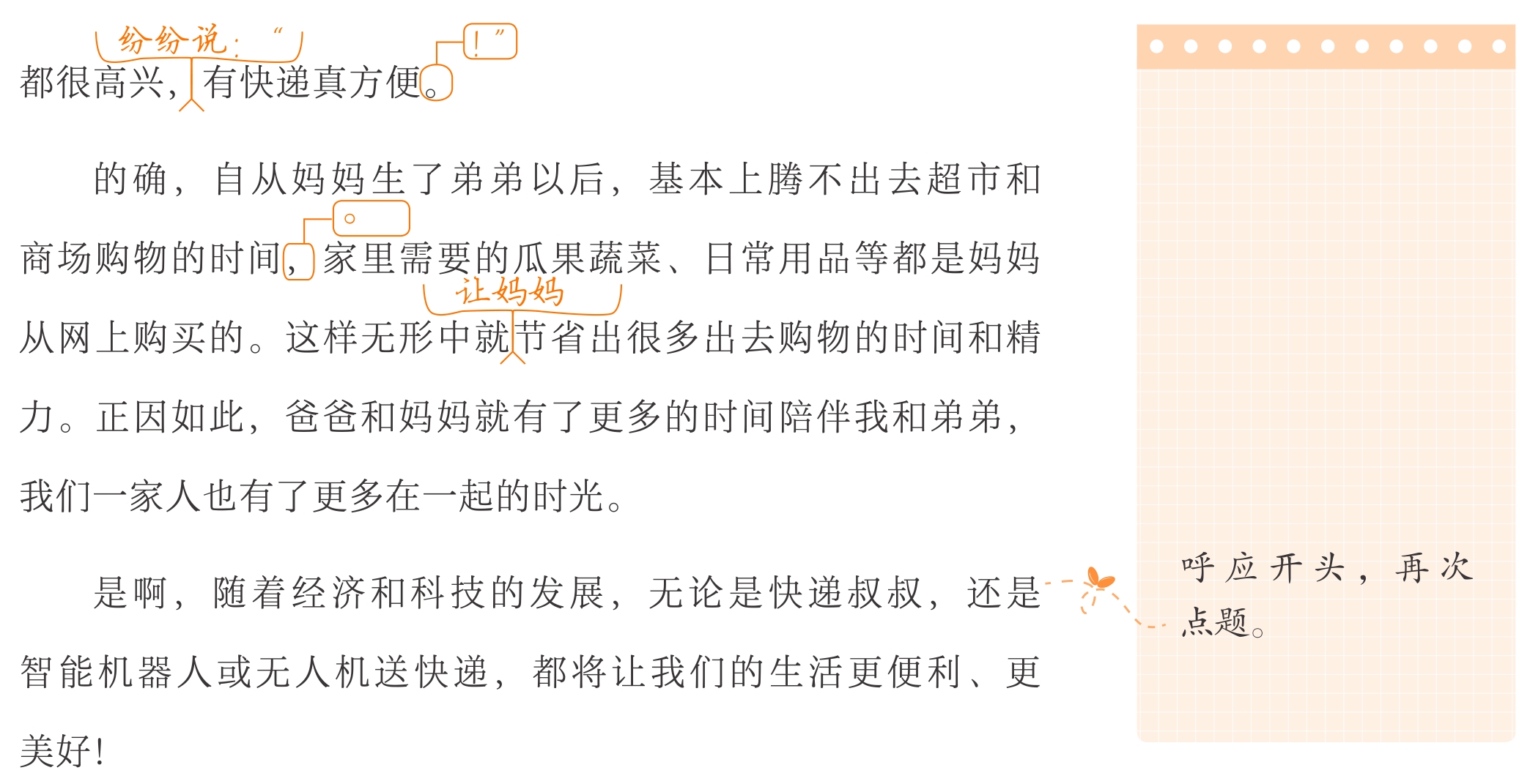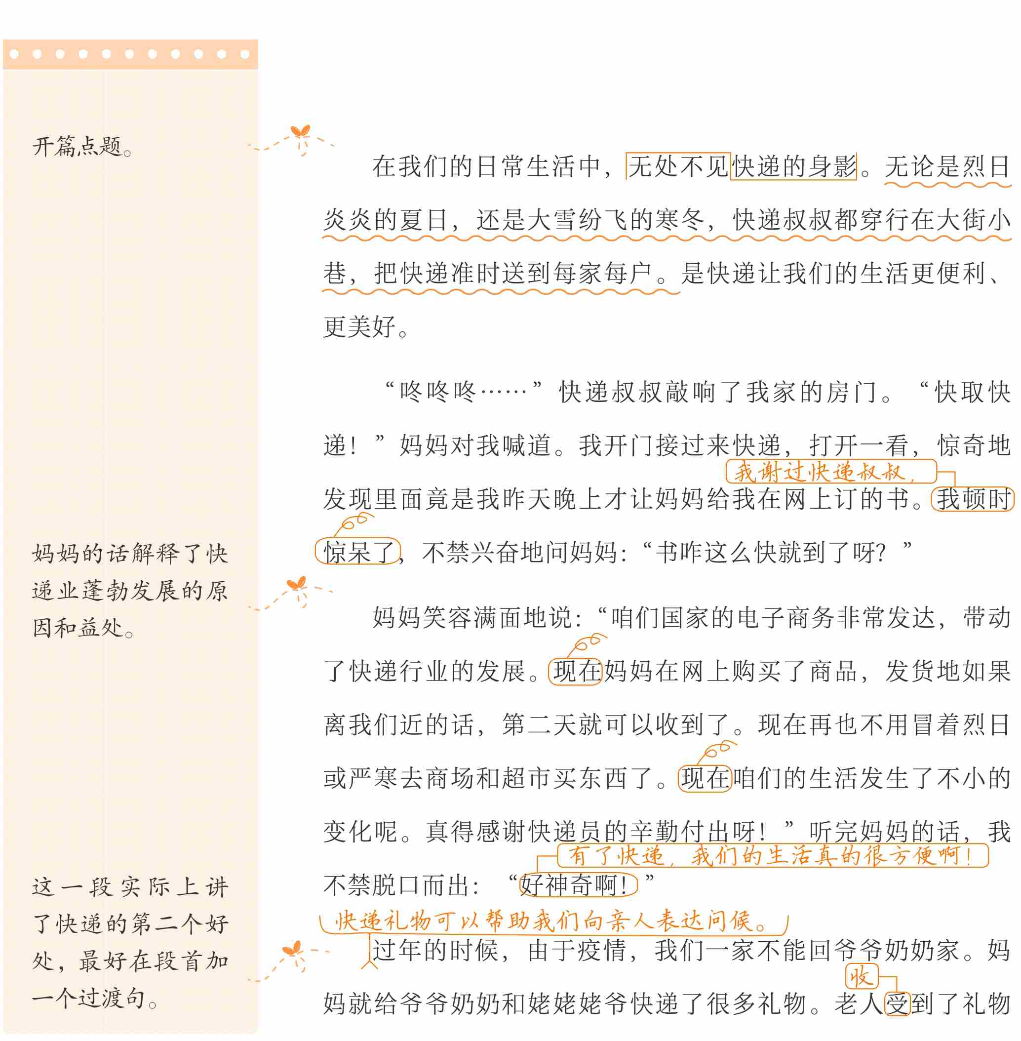 习作开篇用热情的语言描写快递员为了千家万户奔波在街头的情景,表达了对快递员工作的认可和对快递人员的感激之情。然后小作者描写自己突然收到前一晚订购的书而感到惊喜,与母亲进行对话,并进一步感受到快递让我们的生活更美好。但是习作叙事有余,议论不足,文中缺少概括提炼观点的表述,让习作条理不够清晰。建议补足总结句或段首句,亮明观点再引出叙事。