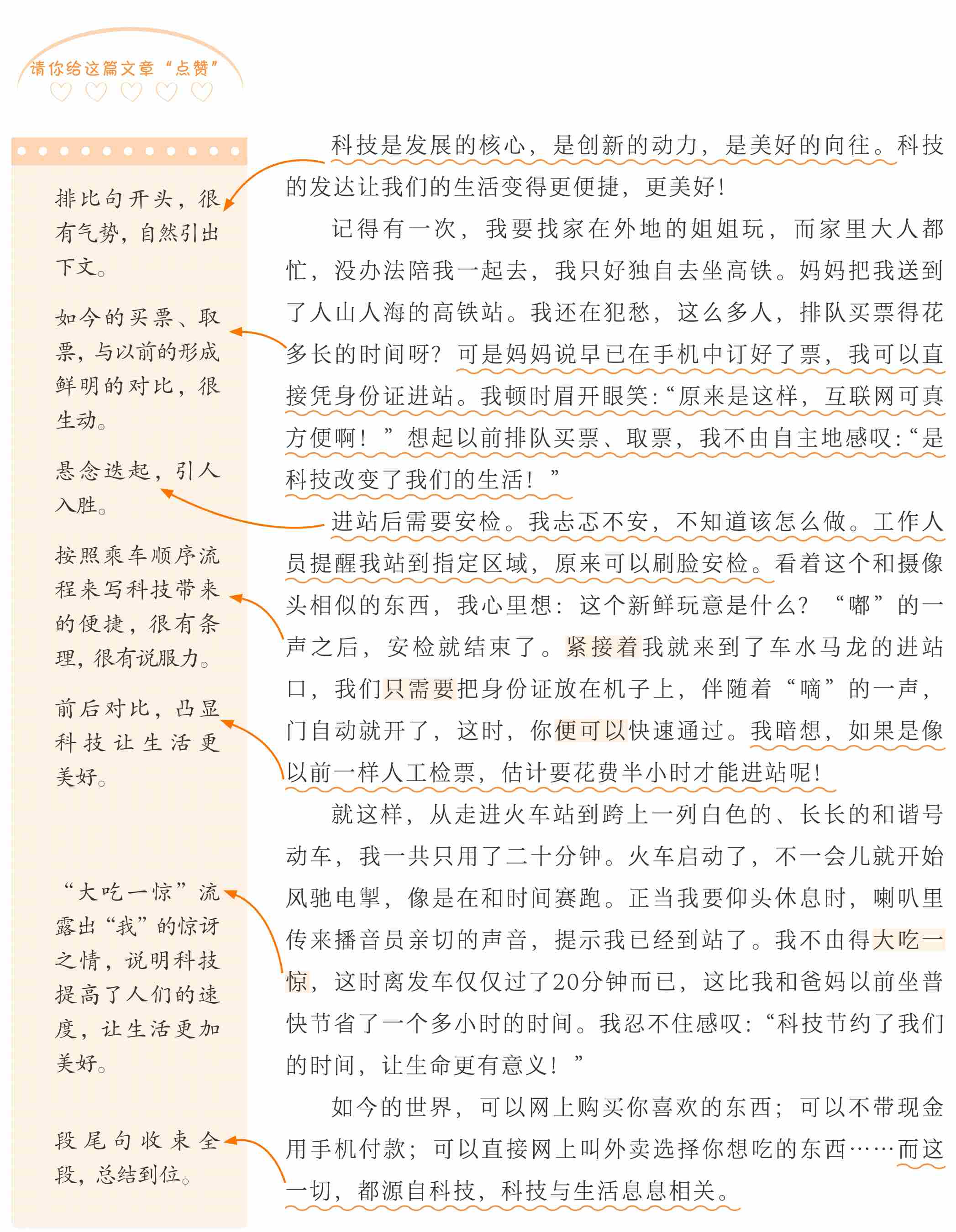 小作者为了说明科技给生活带来便捷、美好,从两个方面展开。前者是详写,按照时间的顺序叙述了坐高铁去外地,感受到科技带来的方便;后者是略写,说明网上购物、付款等与科技密切关联。最后总结全文,流露出对科技的喜爱与赞叹之情。