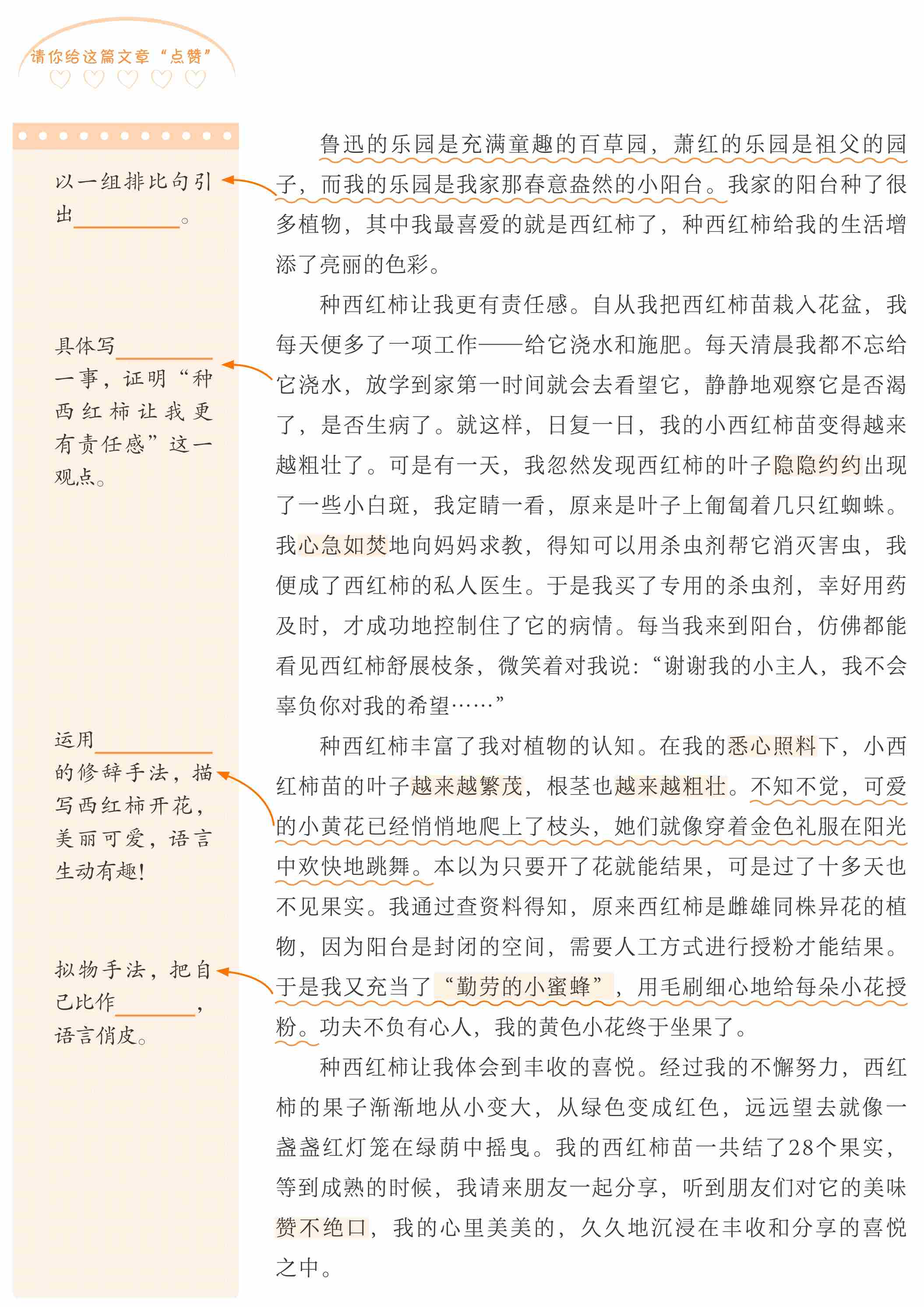 本文取材于生活,有扎实的生活体验做素材,无论叙事、描写,或是抒情、议论都信手拈来,自然贴切,充满感情。习作的结构很严谨,采用排比段,围绕“种西红柿让生活更美好”这一观点,从三个角度谈感受,采用先概括、后具体的构段方式,一唱三叹,将主题层层推进。用以说明观点的事例典型有说服力,让读者透过文字能充分感受小作者的自豪与快乐。