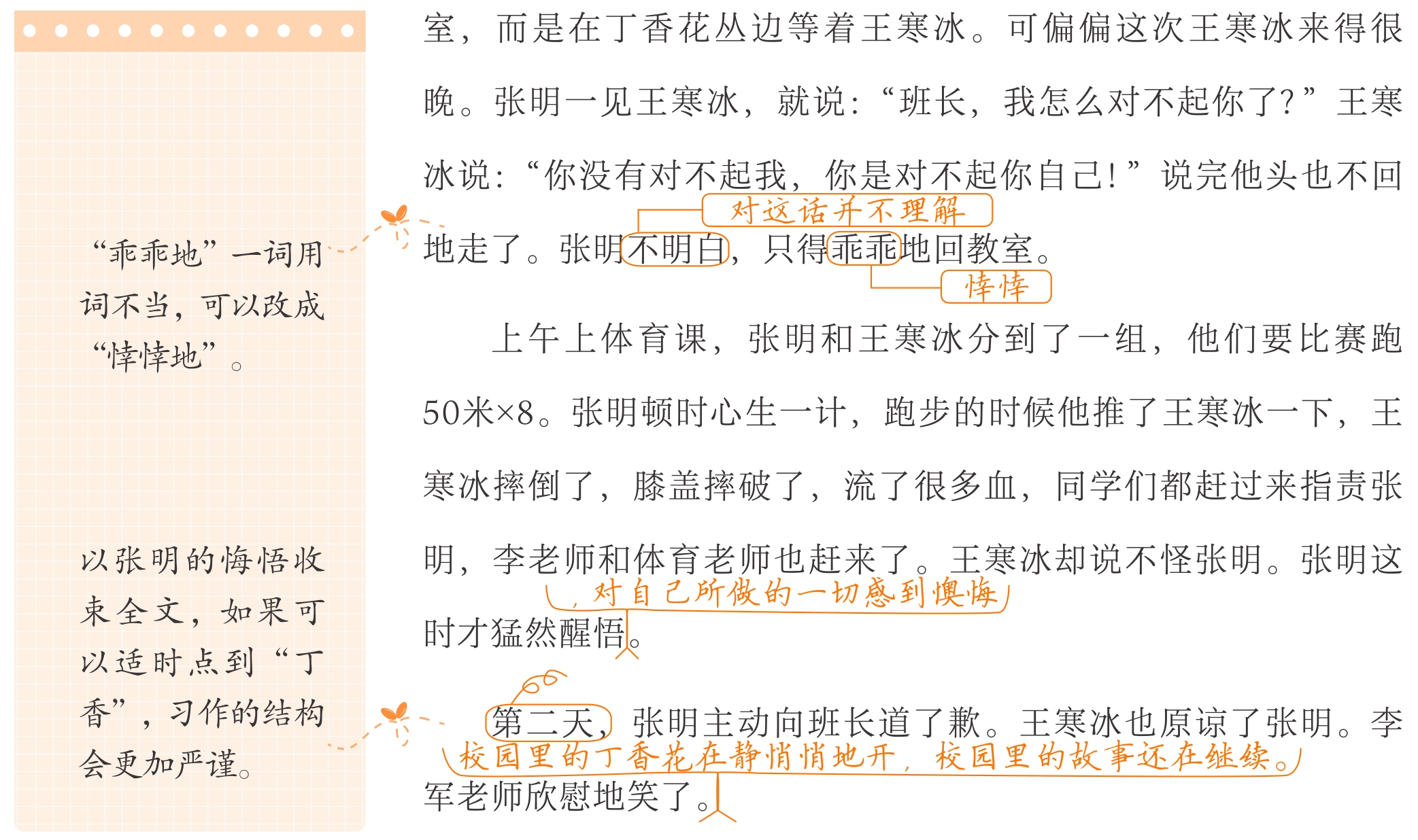 故事的经过不能太简单!首先要围绕主要人物展开,其次可以用小标题的形式梳理。如《穷人》一课的情节是:桑娜担心西蒙——想抱回两个孩子——担心渔夫揍她——抱回两个孩子——渔夫同意安慰。如果写开满丁香花的校园,你会怎样编写故事情节呢?可以试着设计几个小标题。