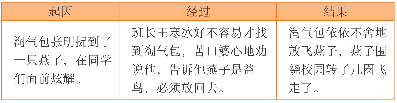 首先要明白故事有一定的顺序——事情发展的顺序,对事情的起因、经过和结果要了如指掌,只有这样,故事才会有条理。以“淘气包的故事”为例: