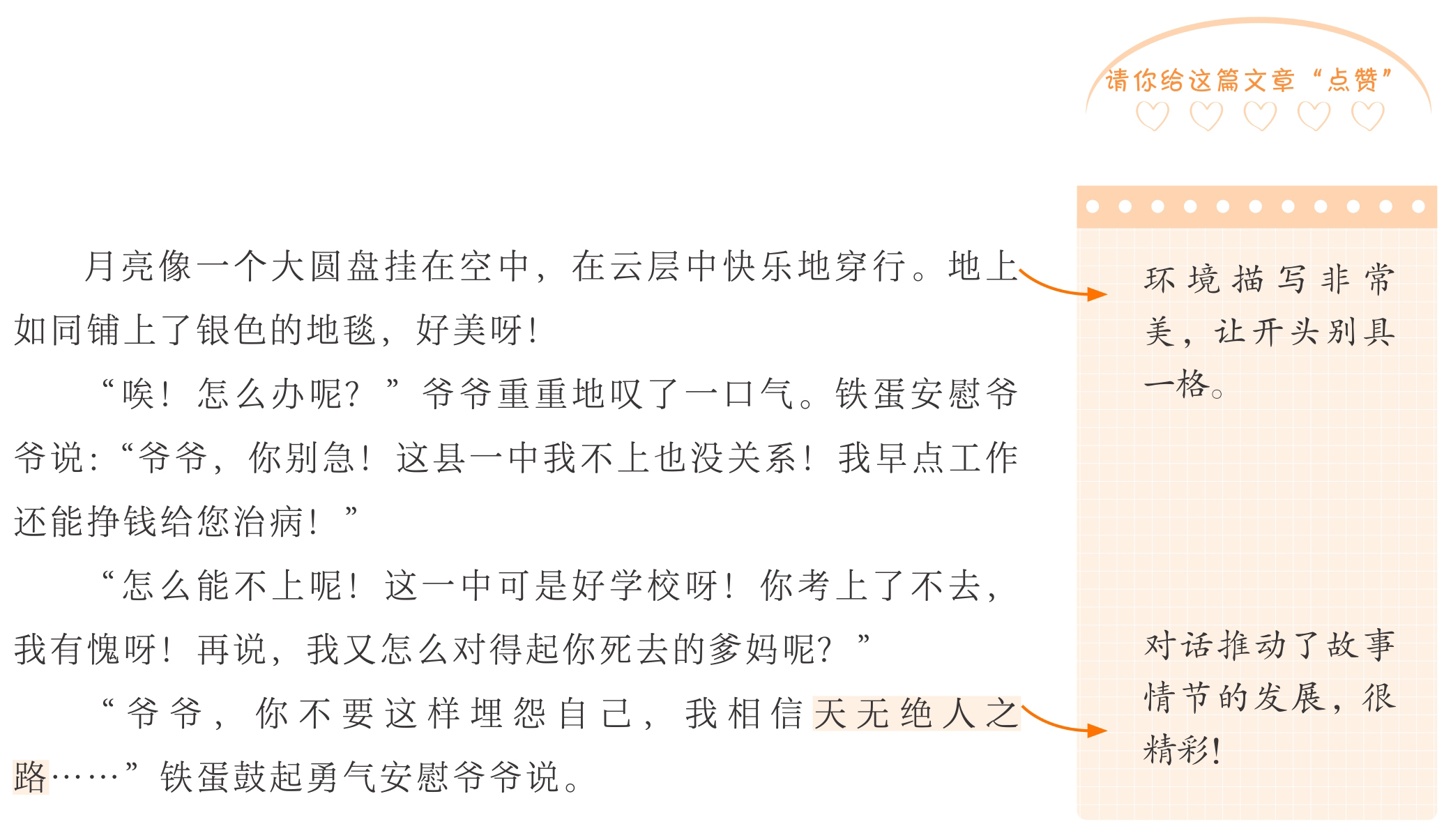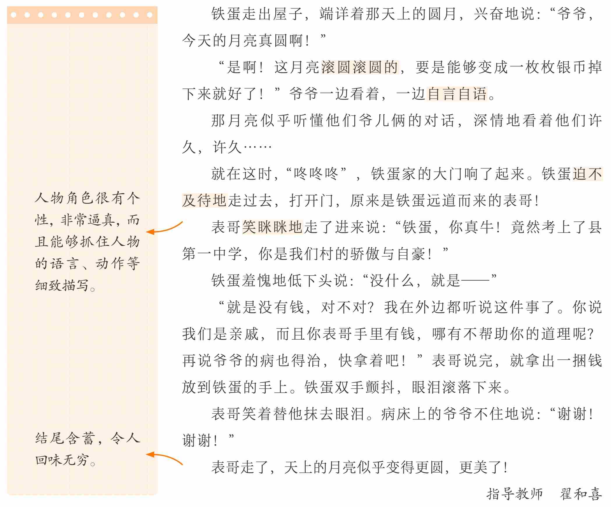 习作开篇的环境描写很美,将读者带入一个美好的意境。习作的结尾与开头遥相呼应,让结构更加紧凑,而且描写情景交融,颇具诗意。故事能够围绕主要人物铁蛋展开,精心设计情节,先写铁蛋因为家贫,准备弃学,爷爷长吁短叹没有办法,然后笔锋一转,写表哥带着钱上门送温暖,解了祖孙两个的燃眉之急。这样安排,就让故事情节一波三折,很吸引人,而且故事的主题思想积极向上,特征鲜明。