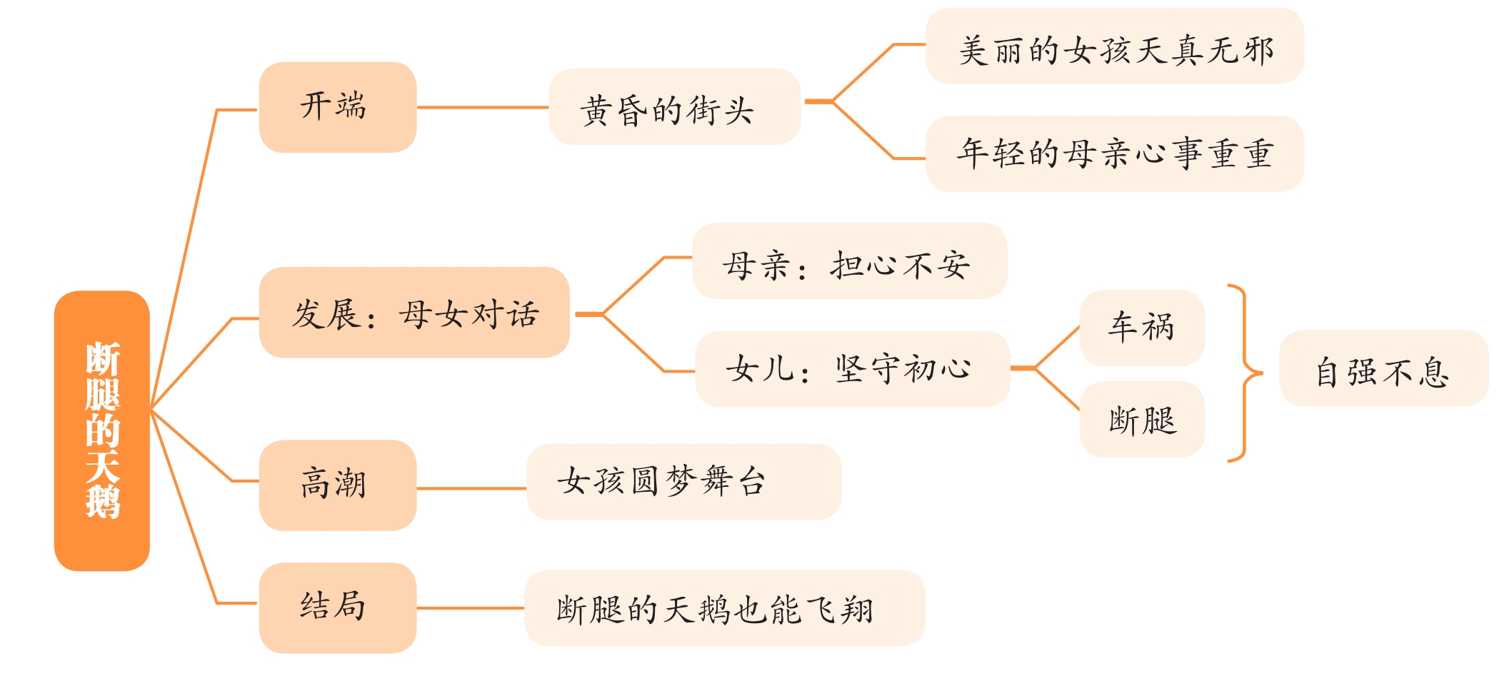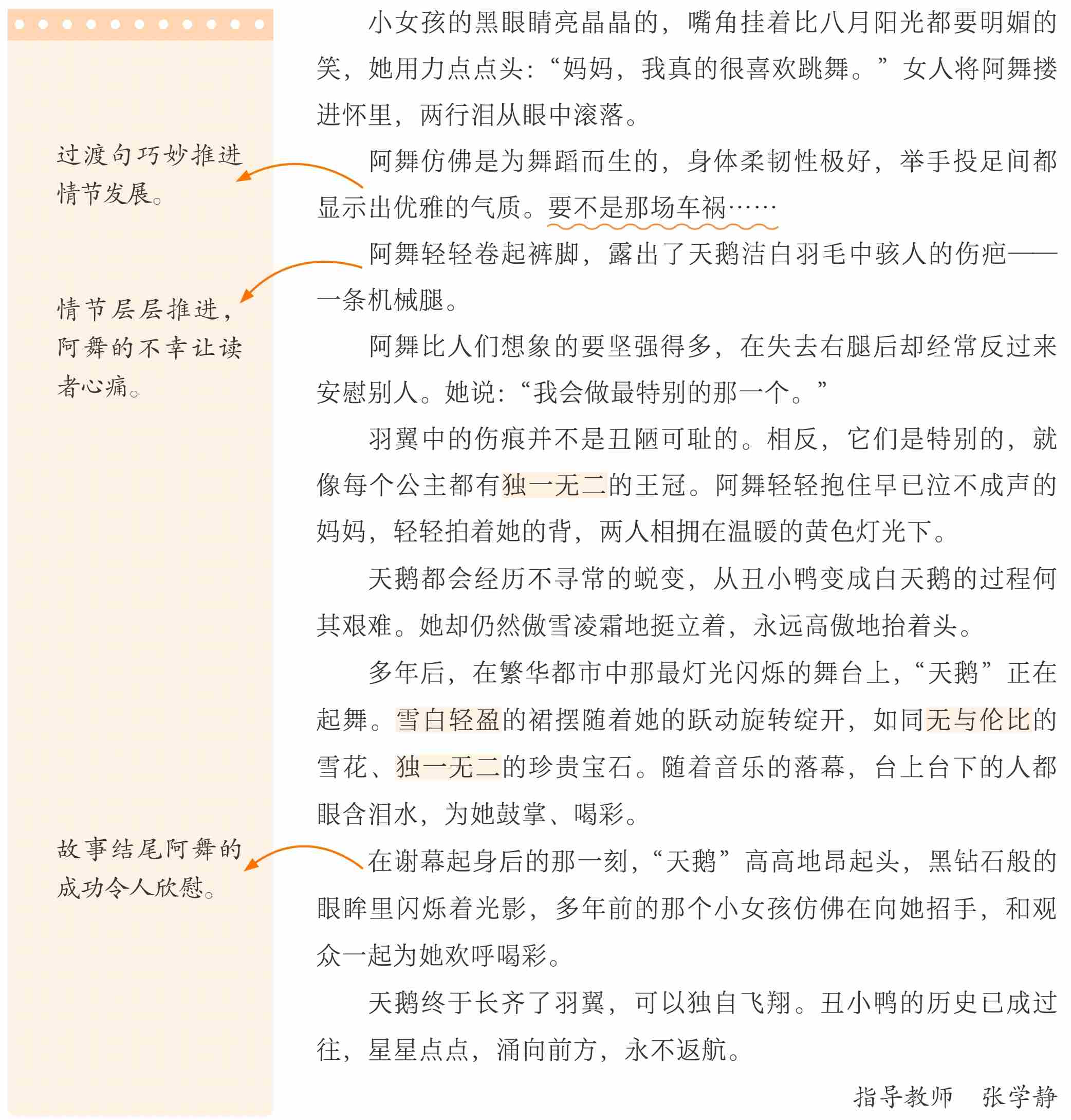 这是一个很励志、很感人的故事。写了一个断腿的小女孩执着地追求舞蹈梦想,获得母亲支持,并最终实现梦想的故事,故事情节设计十分巧妙,没有着力描写女孩怎样刻苦训练,而是借助电影手法呈现出几组画面:母女牵手走在夕阳里—母女交心决意练舞—残疾女孩圆梦舞台。借助母女对话及心理描写刻画出人物鲜明的个性,故事引人思考,耐人回味。习作文笔清新,构思别具一格!