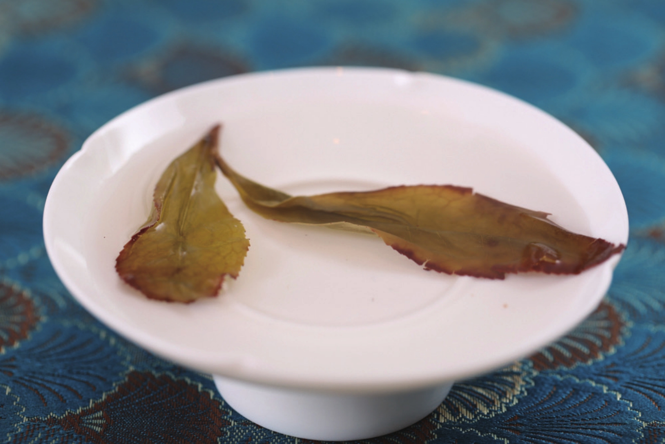 将叶底倒入白色瓷盘,茶叶好像复活了,肥厚柔软、红边闪现、均匀透亮,叶张主脉宽、黄,弹性好,丝滑如缎,这些也都是好的茶叶品质的特征。