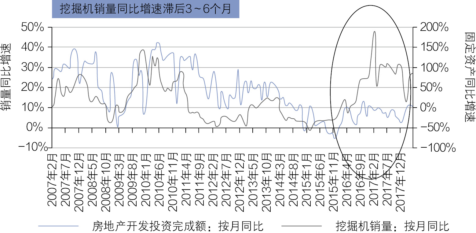 图2-2 中国挖掘机销量同比增速与房地产开发投资完成额同比增速的“非理性”的“剪刀差”