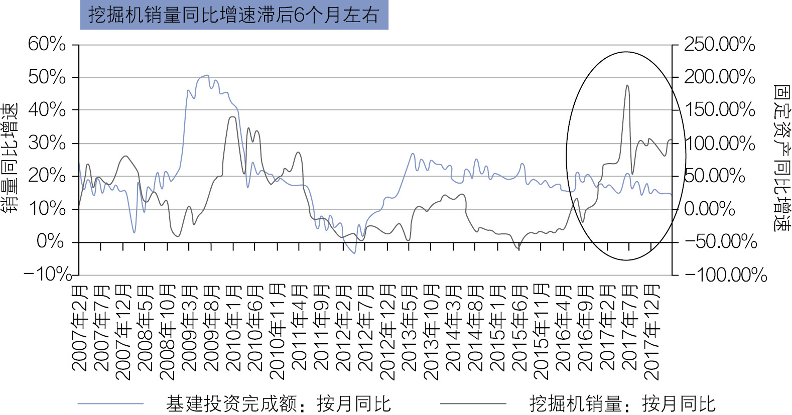 图2-3 中国挖掘机销量同比增速与基建投资完成额同比增速的“非理性”的“剪刀差”