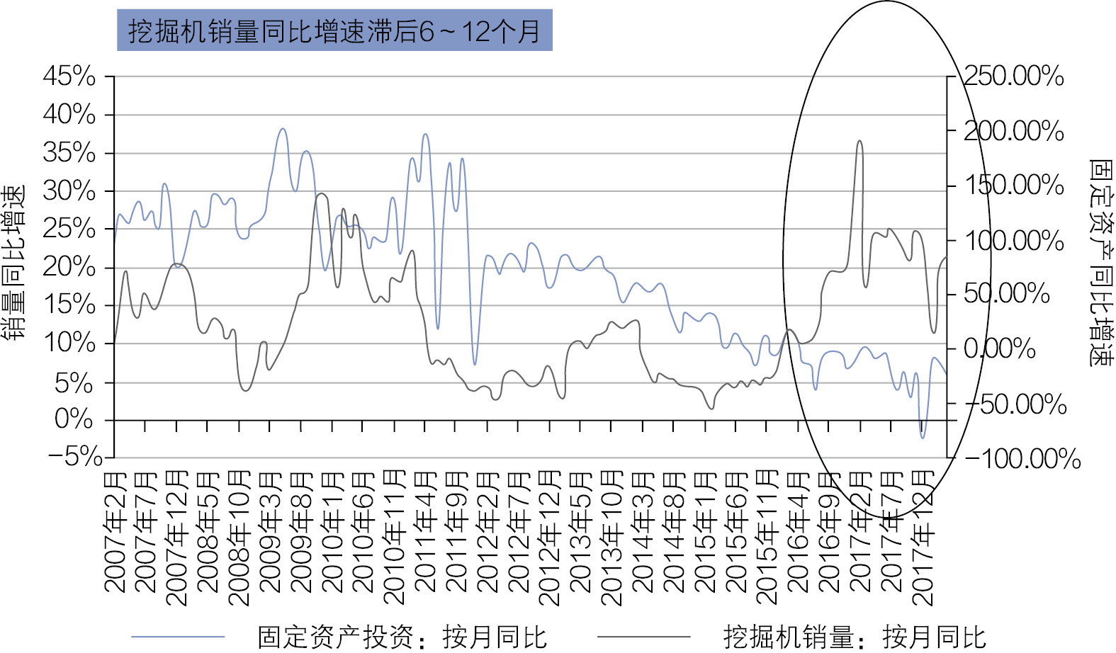 图2-1 中国挖掘机销量同比增速与固定资产投资同比增速的“非理性”的“剪刀差”
