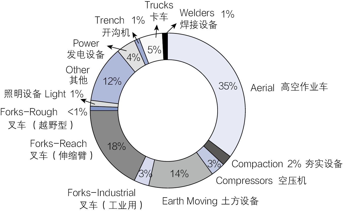 图3-2所示为URI在2018年的租赁设备结构。许多人对这一结构津津乐道,以为找到了中国版URI的门道。按照这一设备结构的比例,需要拥有大量的高空作业设备(22多万台,占比35%),这似乎已经成为中国版URI的一个追求目标,这也是当下许多租赁公司对高空作业设备大量采购的原因之一。可是,就中国市场实情来看,这一逻辑合理吗?