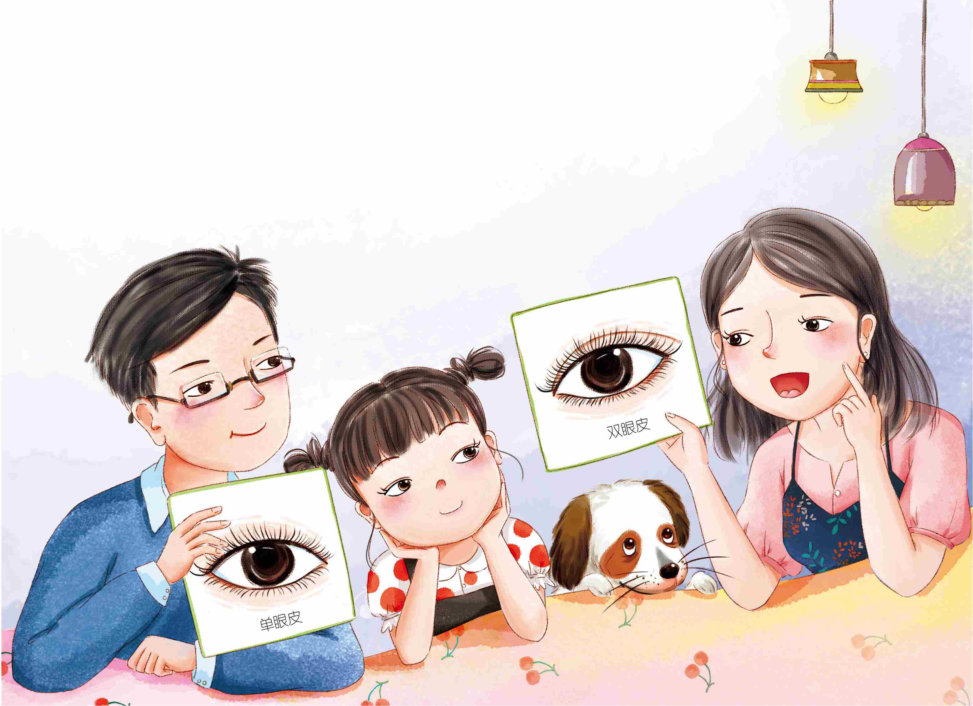 我们是单眼皮还是双眼皮,是由父母的遗传基因决定的哦。小朋友,你是双眼皮还是单眼皮?爸爸妈妈呢?