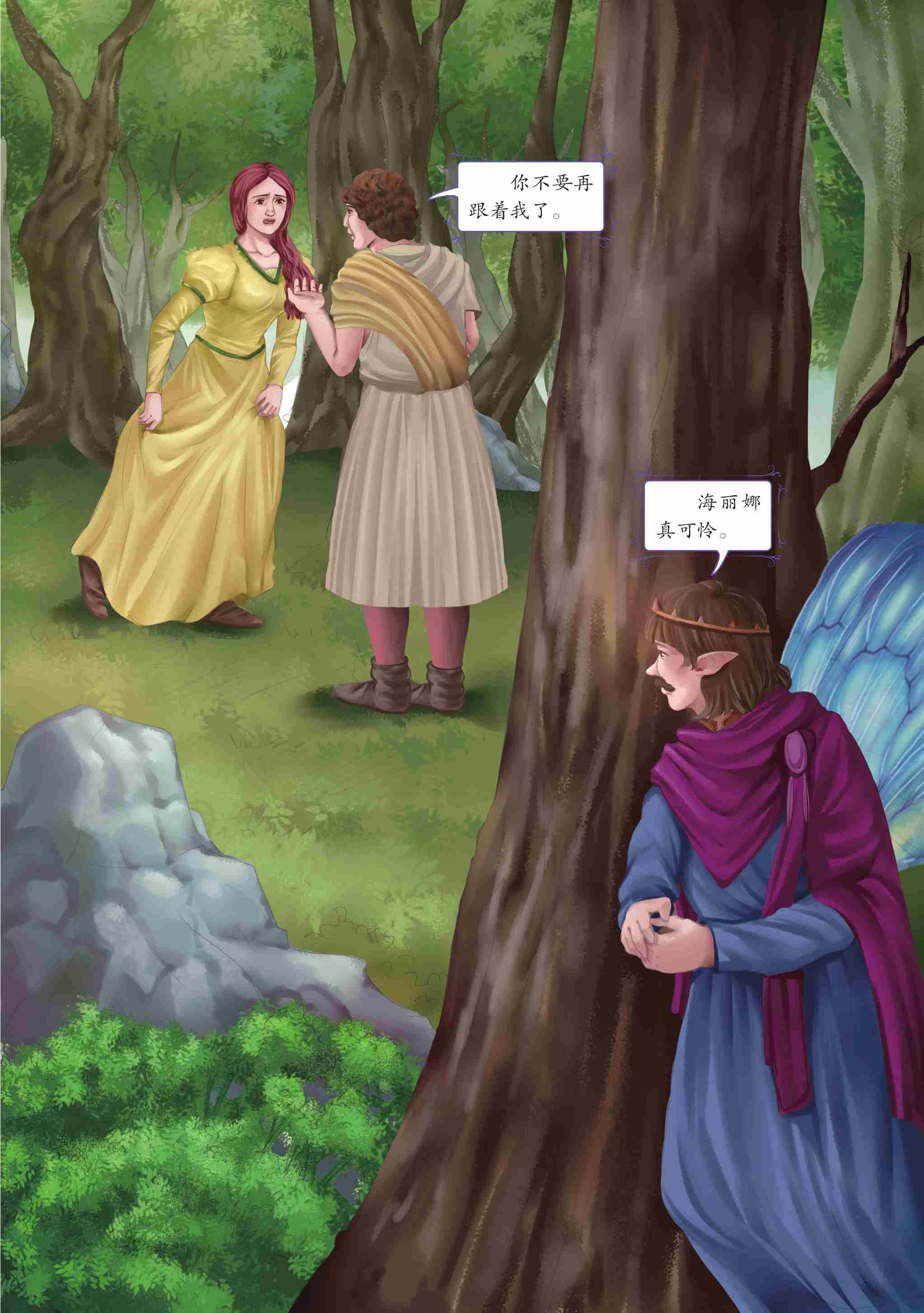 狄米特律斯没办法了,他转身就走,边走边说:“我要躲在丛林中,就算野兽吃掉你,我也不会救你!”