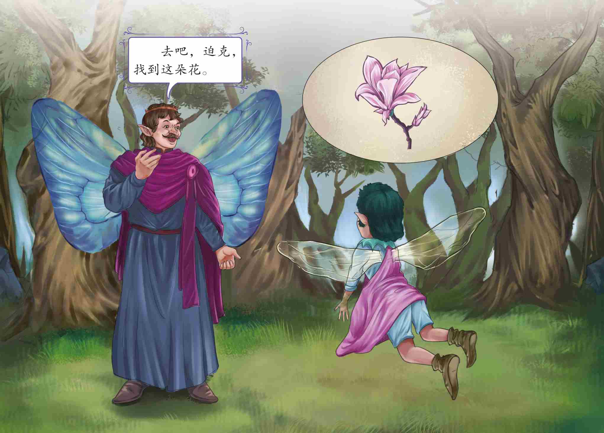 “真是个好主意!”奥布朗说,“可是,那个迫克跑到哪里去了,怎么还不回来呢?”他正想着呢,迫克回来了。他把那株紫色的花,交给了奥布朗。