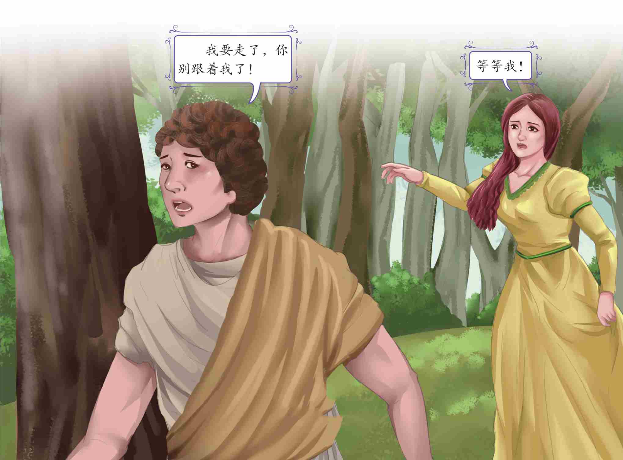 狄米特律斯没办法了,他转身就走,边走边说:“我要躲在丛林中,就算野兽吃掉你,我也不会救你!”