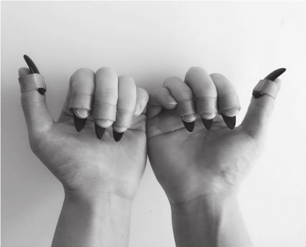 (3)佩戴时,食指、中指、无名指的假指甲尖与手指尖方向是一致的,只有大拇指假指甲尖与指尖的方向不一致,正确佩戴方法如图5所示。