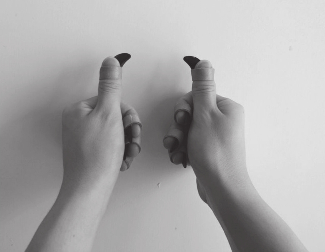 (4)选择假指甲时要特别注意其大小与厚薄。假指甲过大会造成弹奏时手指的弯曲度不够,指尖拨弦不灵活、弹不快;过小会造成自己的真指甲触弦,从而使音色不够坚实。假指甲过厚会使音质发闷、不通透;过薄则会使音量小、音质尖薄。合适的假指甲大小通常与自己手指的第一关节(小关节)长度相近即可,厚度在1毫米左右。