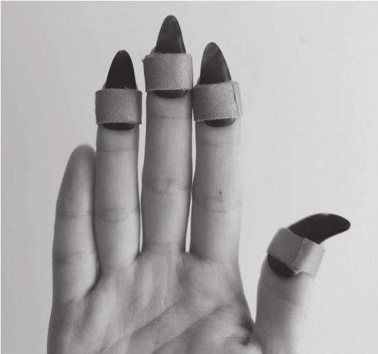 (3)假指甲的形状分为单面弧、双面弧、凹槽三种。双面弧不分左右手,单面弧或凹槽需要注意,有弧度的一面用来接触琴弦弹奏,将平面或凹槽的一面贴紧指肚。