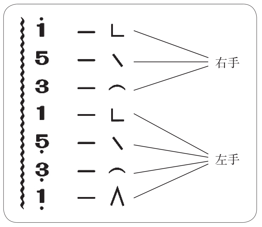 双手“点奏”有很多不同的指法组合,但这些组合方式都是以双手食指“点奏”为基础的。我们首先学习双手食指“点奏”的弹奏,在随后的课程中会将其余组合方式的弹奏方法逐步加入。
