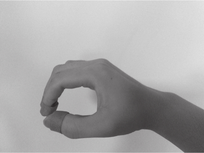 (3)食指、中指、无名指的指尖指向下方,大指指尖指向食指指尖,此时虎口呈大写字母C的形状(左手为正C,右手为反C)。