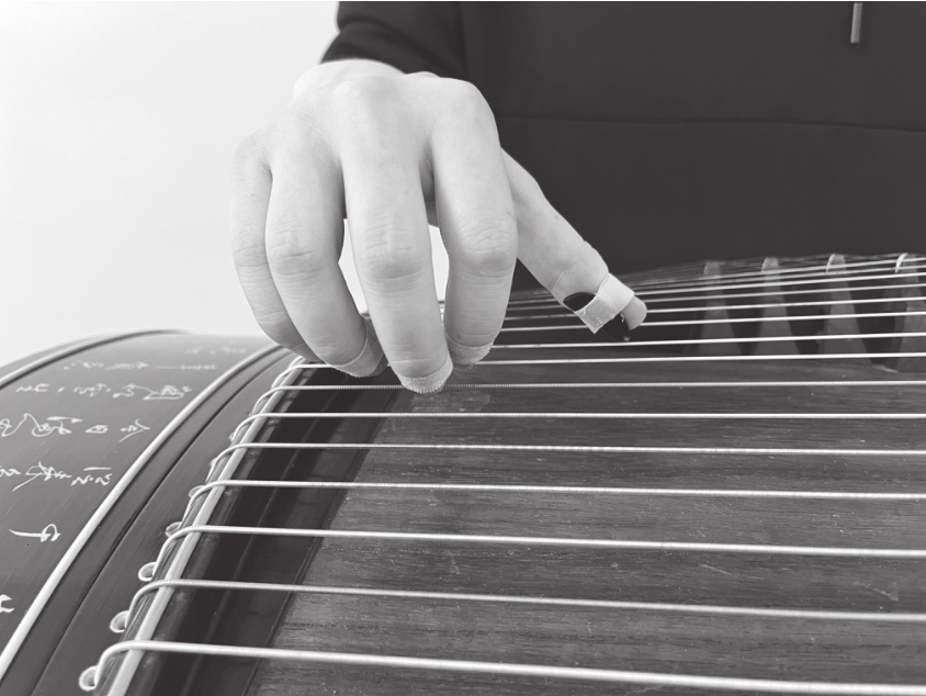 ⑤弹奏时中指要与琴弦基本保持垂直,手背与筝弦面平行,其余手指仍保持半握拳状。