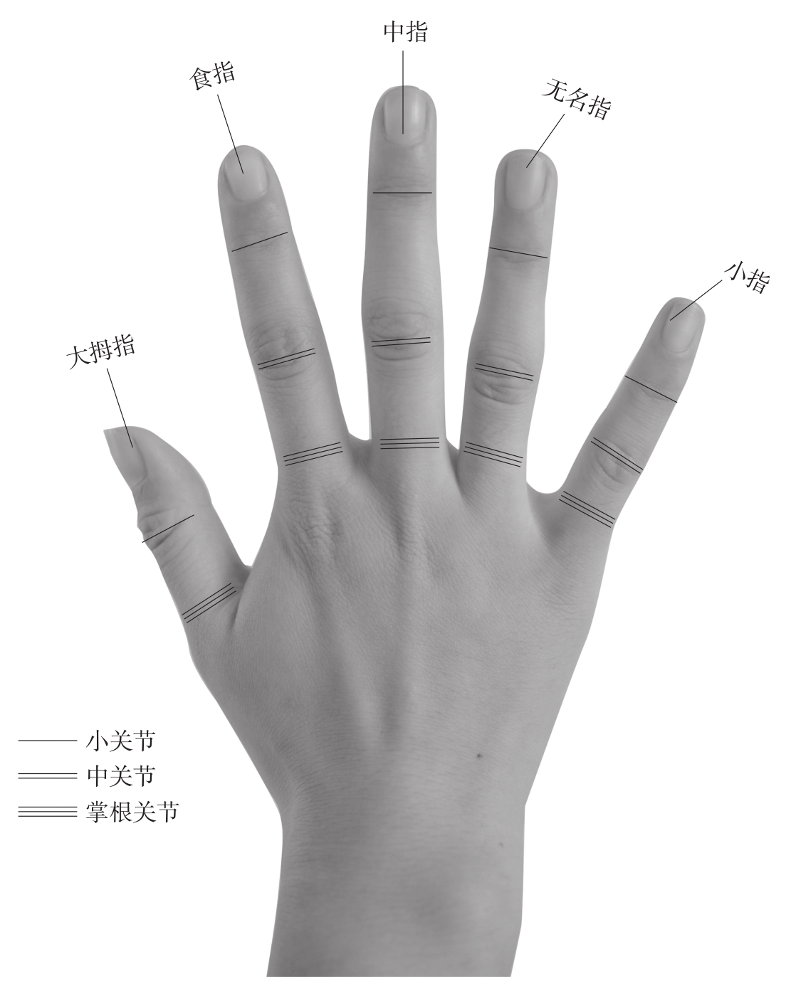 食指、中指、无名指和小指的关节名称从指尖开始分别为小关节、中关节和掌根关节;大拇指只有两个关节,分别为小关节和掌根关节(如图7所示)。