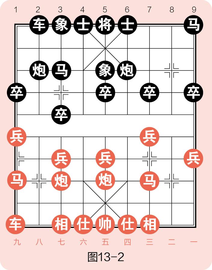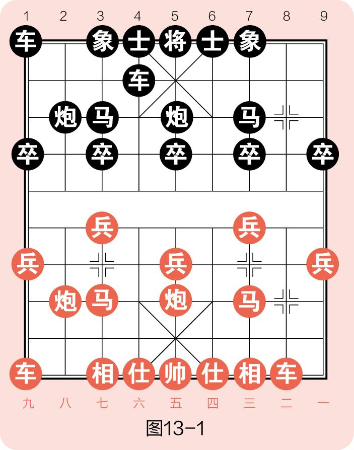 一般记谱有两种方式:完整记录和简单记录。象棋书籍用的是完整记录,比赛时棋手多用简单记录。下面我们用实例来说明,如图13-1,括号里面的是简单记录。