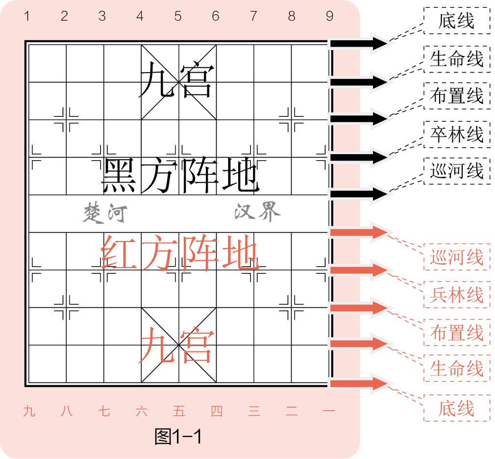 图1-1是各直线和横线的名称,己方的巡河线对于对方来说是骑河线。己方棋盘的左边我们习惯称为左翼,右边称为右翼。双方纵向四线、六线称为肋道线,五线称为中路。