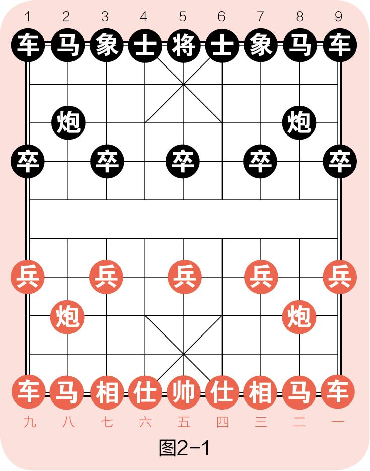 第1课,我们去看了“战场”,熟悉了“地形”,这节课就来认识我们的“军队”,了解我们的“将士”,并指挥它们进入预定的作战位置。图2-1就是棋子的原始摆放位置。