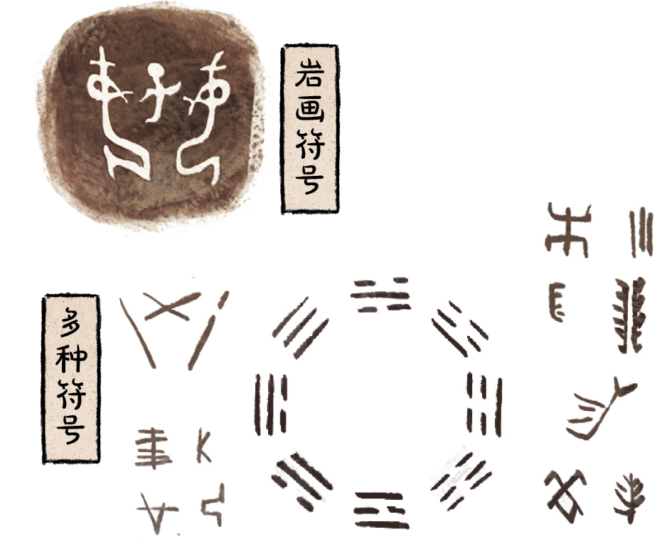 原始社会晚期的岩画符号、陶刻符号和八卦符号都与汉字的起源有联系。考古发现证明,汉字是先民根据自然事物、人类自身以及生活用具等各种形象加以概括归纳而创造的。也就是说,这些我们现在看起来奇奇怪怪的符号,都是汉字的老祖宗。