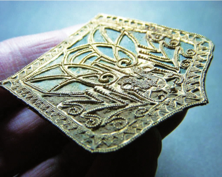 ①1950~1952年在河南辉县固围村战国遗址的发掘中,发现了用银箔镂空刻花的弧形装饰物。