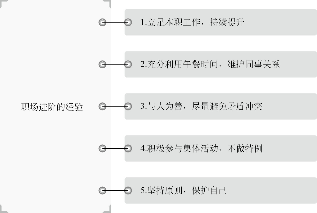 杨小姐获得职场进阶的经验及其工作原则主要有如下几点,如图1-5所示。