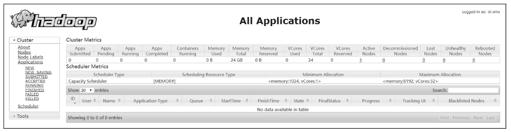 ② 通过在Web端输入ResourceManager地址和端口8088,可以查看YARN上任务的运行情况。例如,在浏览器输入http://hadoop103:8088,即可查看本集群YARN的运行情况。YARN的Web端如图3-3所示。