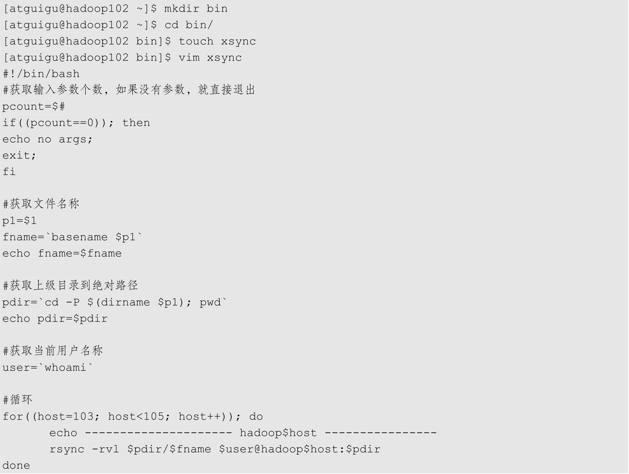 (1)在/home/atguigu目录下创建bin目录,并在bin目录下使用vim命令创建文件xsync,文件内容如下。
