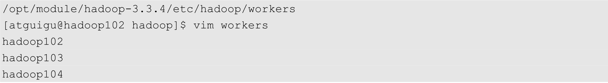 ⑤ 主节点服务器 NameNode 和 ResourceManager 的角色在配置文件中已经进行了配置,而从节点服务器的角色还需指定,配置文件workers就是用来配置Hadoop分布式集群中各从节点服务器的角色的。如下方代码所示,对workers文件进行修改,将三台节点服务器全部指定为从节点服务器,启动DataNode和NodeManager进程。
