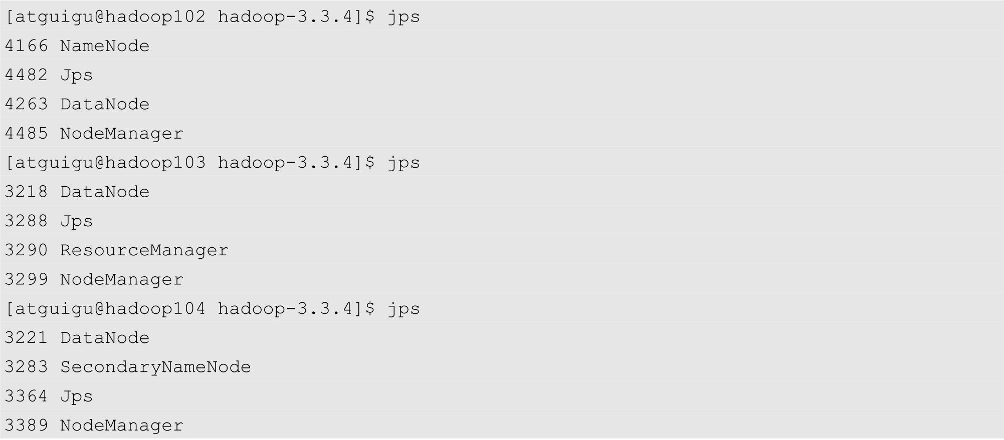 通过执行jps命令,可在各台节点服务器上查看进程启动情况,若显示如下内容,则表示启动成功。
