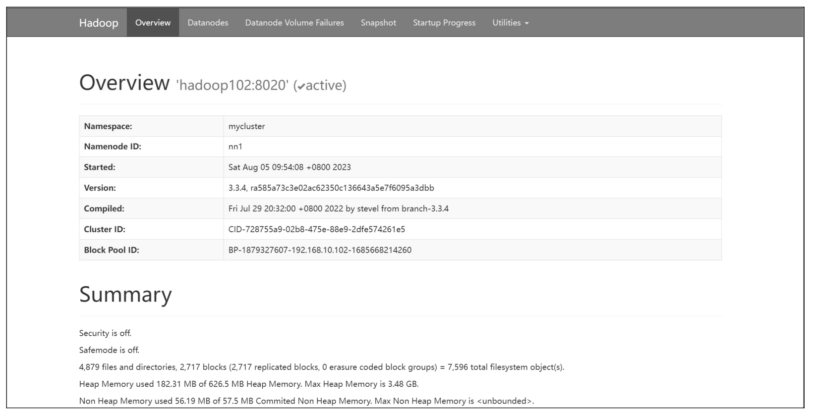 ① 在Web端输入之前配置的NameNode的节点服务器地址和端口9870,即可查看HDFS文件系统。例如,在浏览器中输入http://hadoop102:9870,可以检查NameNode和DataNode是否正常。NameNode的Web端如图3-2所示。