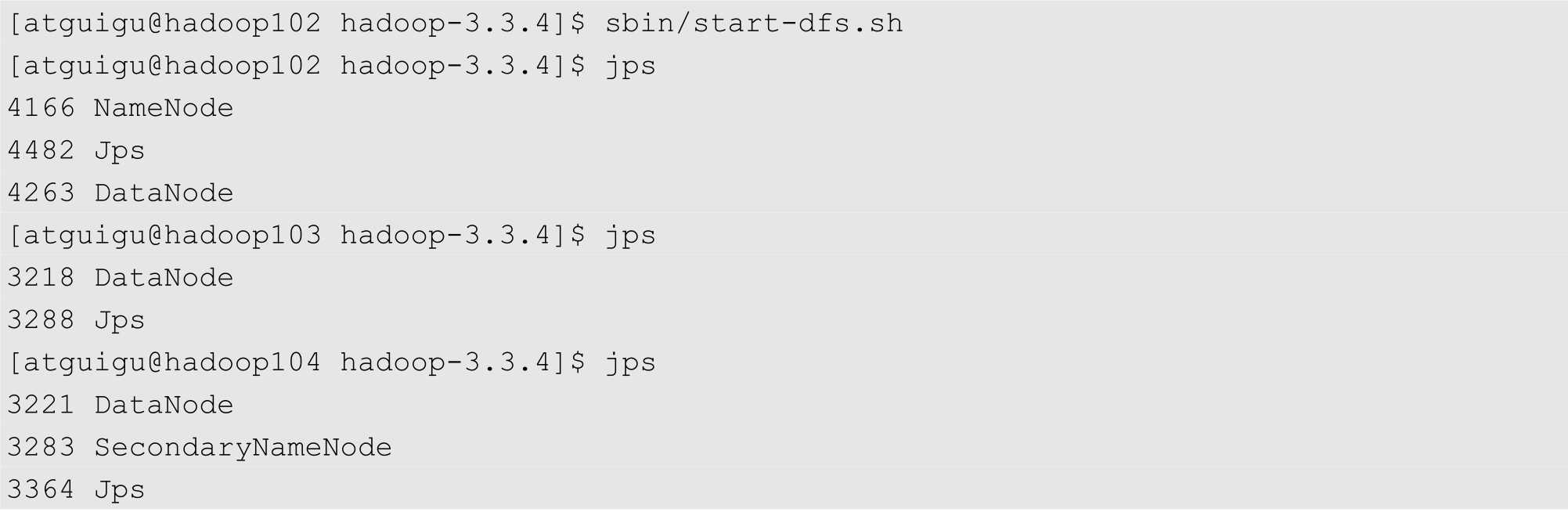 ② 在配置了NameNode的节点服务器后,通过执行start-dfs.sh命令启动HDFS,即可同时启动所有的DataNode和SecondaryNameNode。