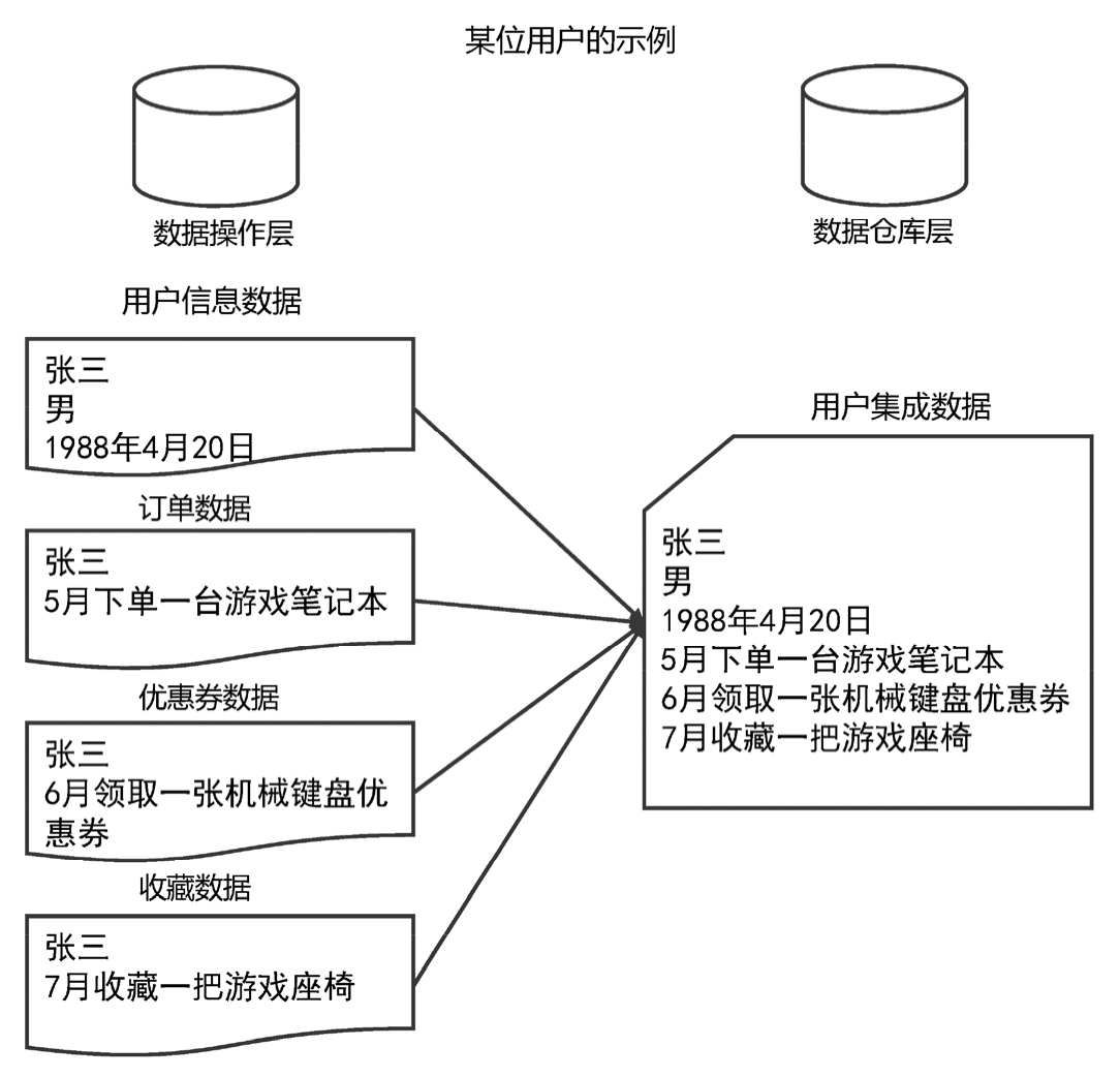 体系结构化的数据仓库环境的一个重要作用就是数据的集成,当把数据从操作型环境载入数据仓库环境时,如果不进行集成,就没有意义。数据集成的示例如图1-1所示。某位用户在数据操作层产生了四条数据,这四条数据分别被存储在用户信息表、订单表、优惠券表、收藏表中,显示了用户的不同操作方式。四条不同的数据在被抽取到数据仓库层时会进行聚合,得到右侧的集成数据,其中显示了同一位用户的所有行为,我们根据用户的这条集成数据得知此用户是一位游戏爱好者,此时给他推送与游戏相关的产品更有可能增加销量。
