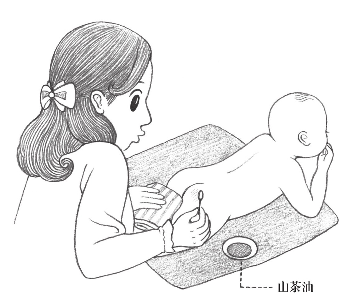 便后给宝宝冲洗屁股,擦干后涂上薄薄的山茶油,不要马上换上新尿布